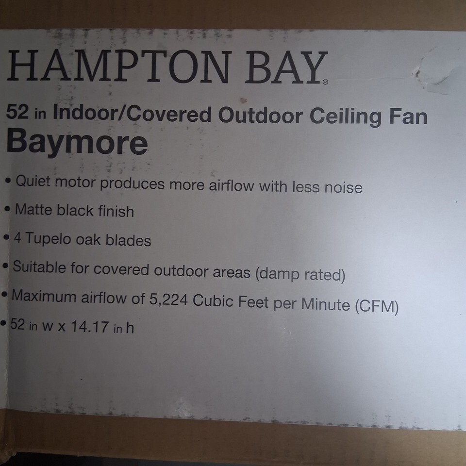 Hampton Bay Baymore Matte Black Ceiling Fan 52 In. Indoor/Outdoor with Remote
