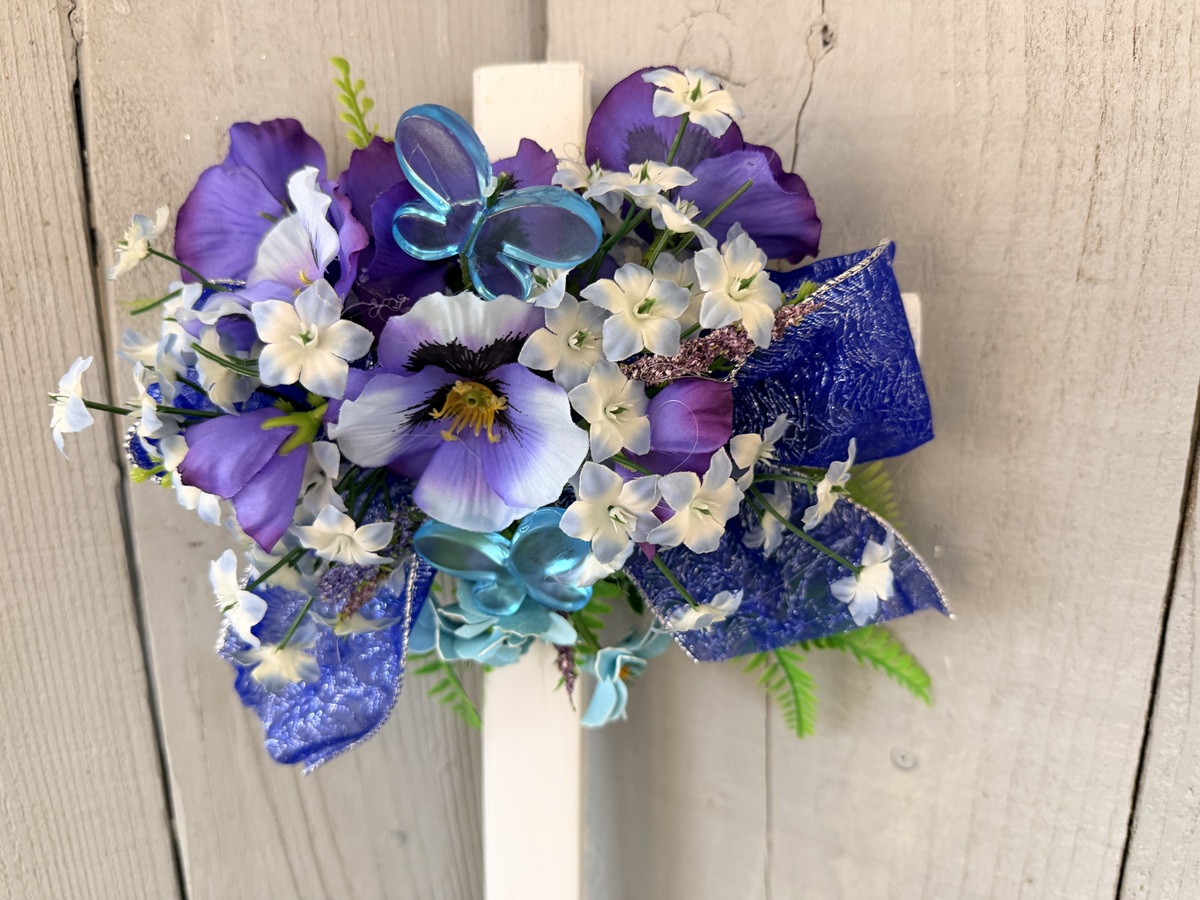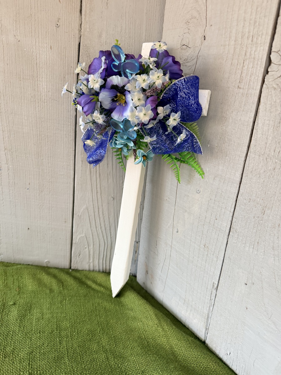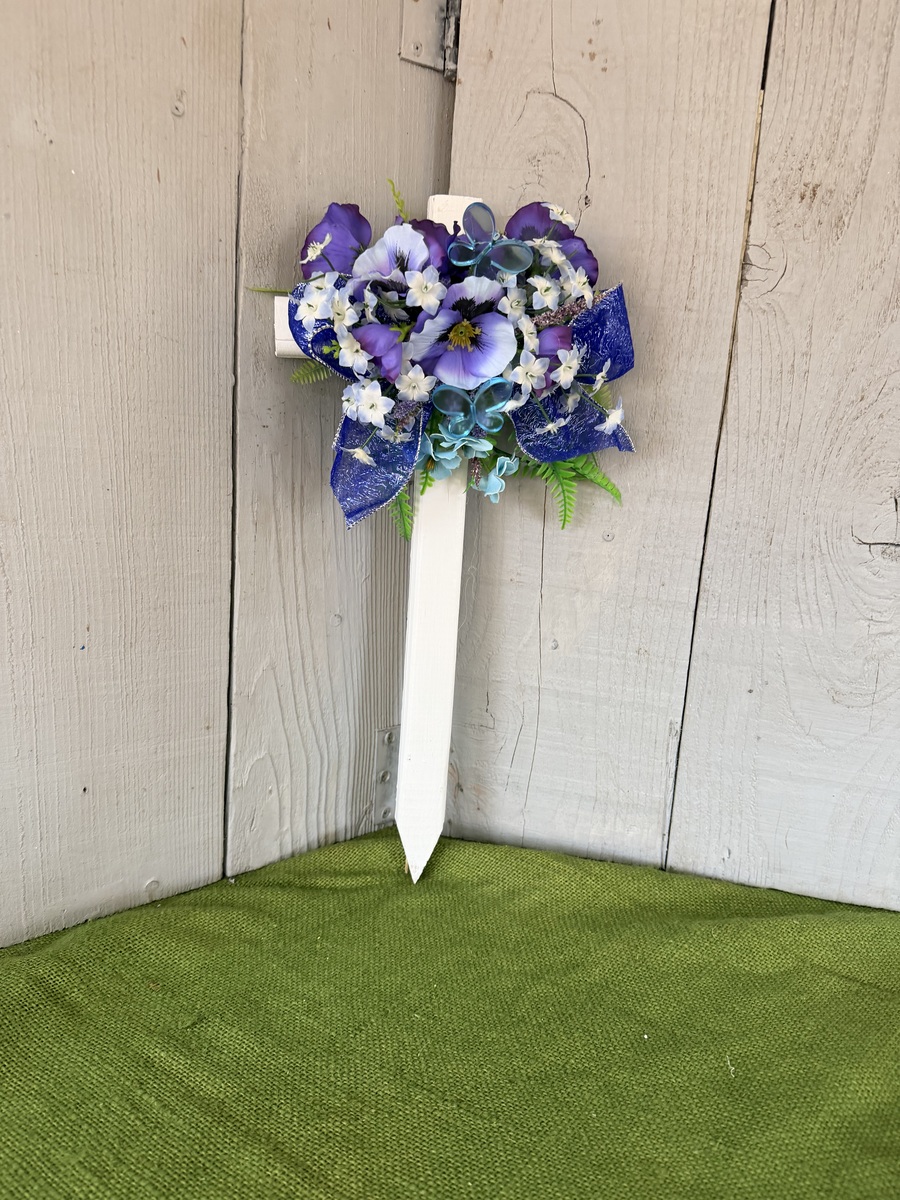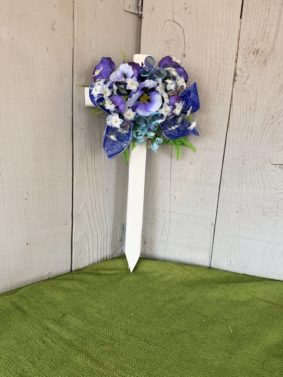 blue grave flowes, Butterfly memorial flowers, cross memorial