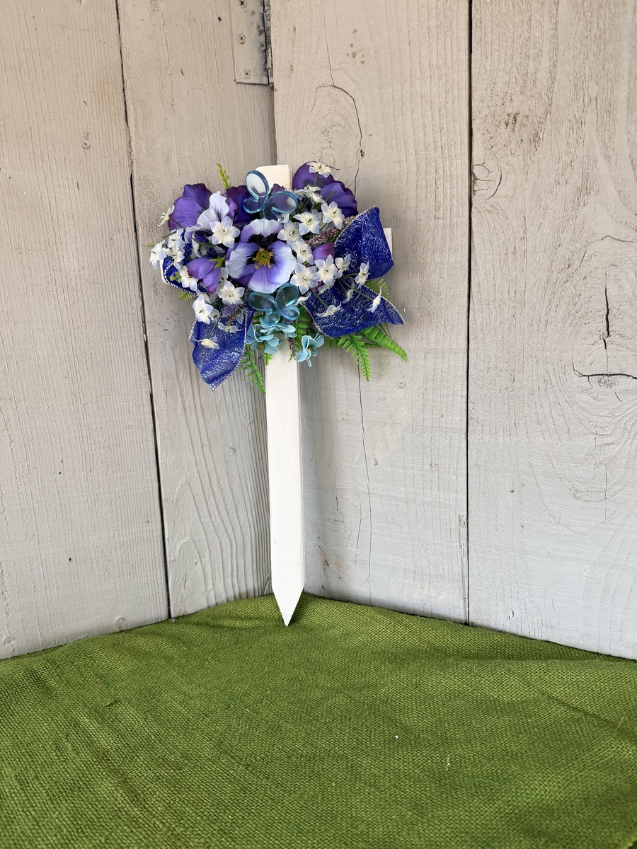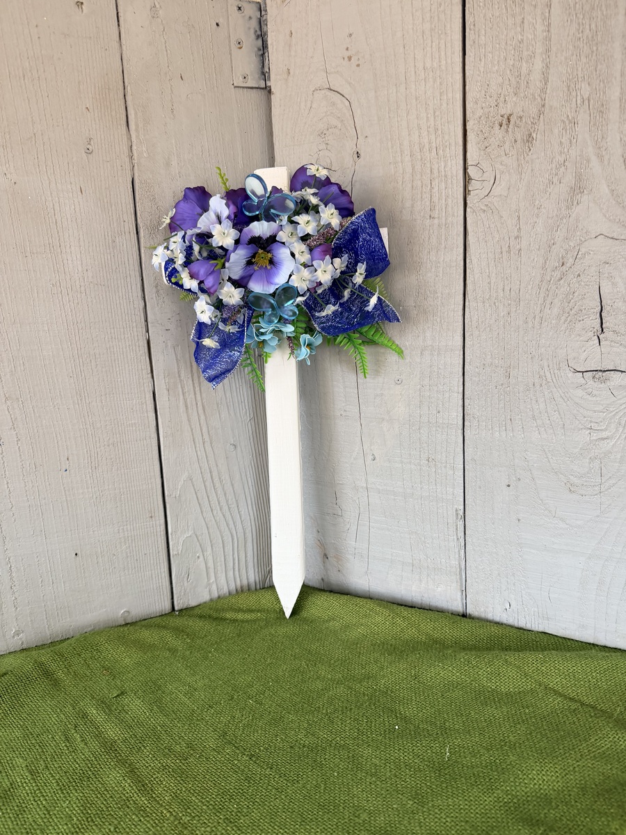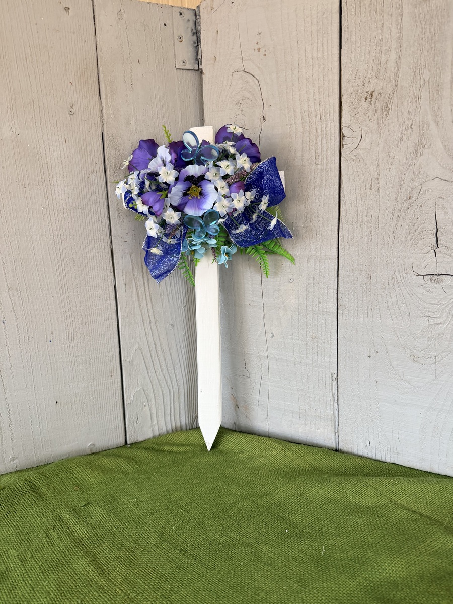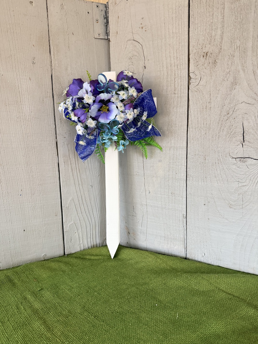 The cross has a pointed end for easy ground insertion. Every cross is sprayed with a coat of clear polyurethane to protect the ribbon and silk flowers from outdoor elements.