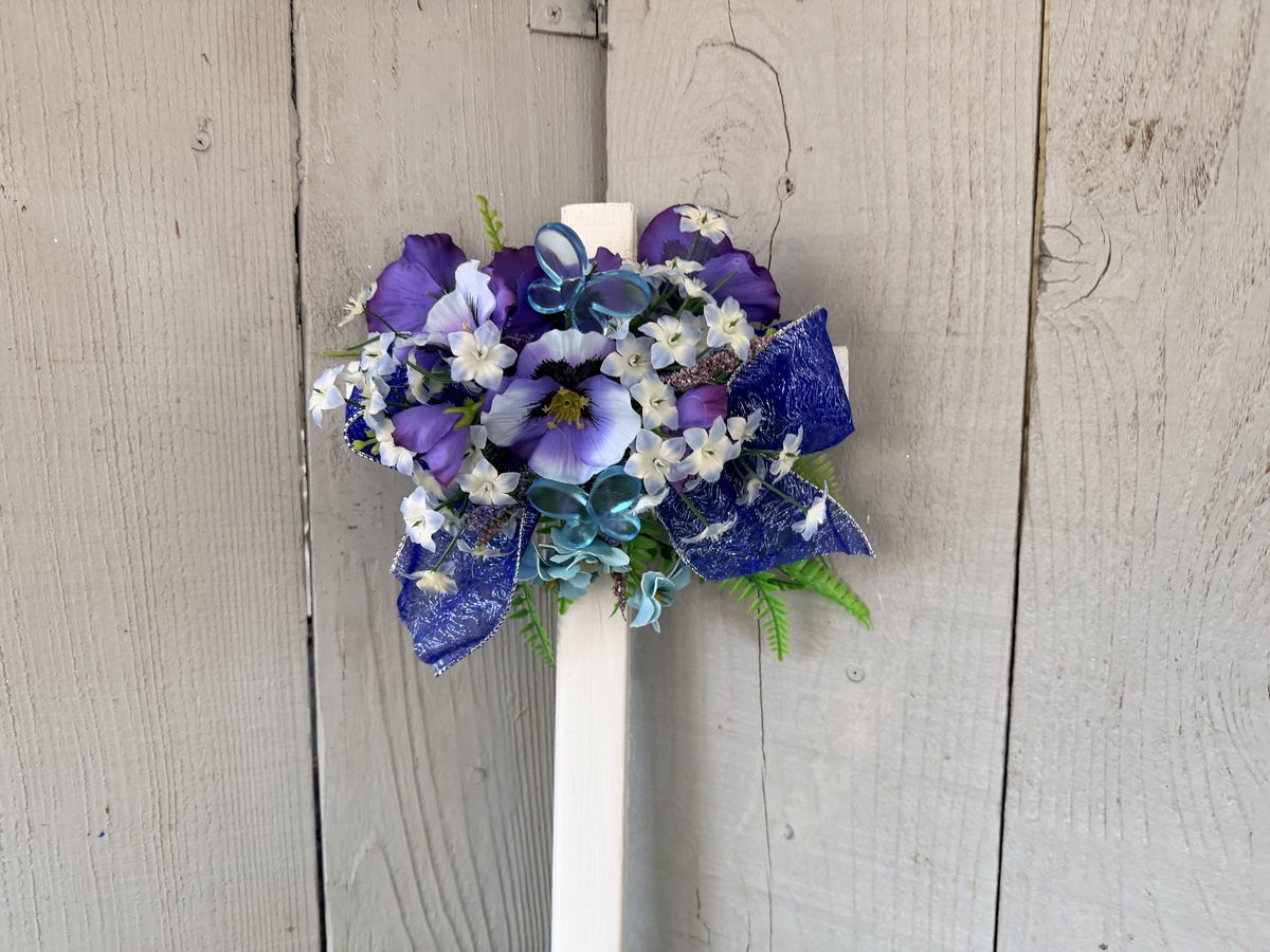 This 18” pine cemetery cross has been painted ivory with a blue hydrangea, dark blue mums, blue wildflowers, blue snapdragons, layers of greenery, and bright blue ribbon.