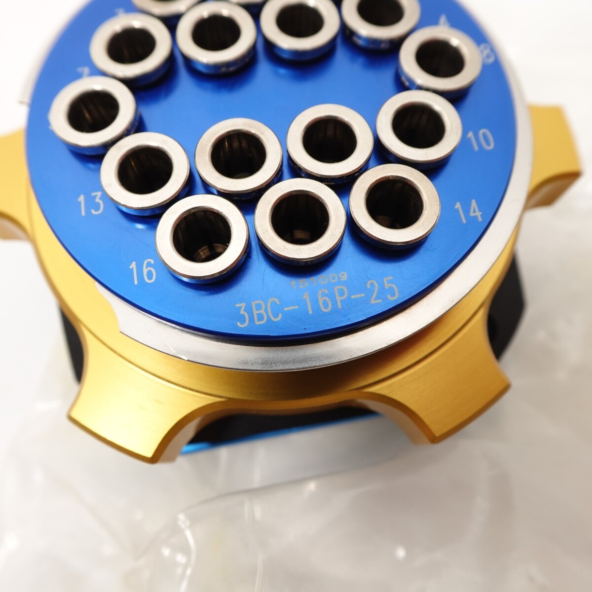 For sale: Twintec 16-position rotary/test adapter, marked 3BC-16S-25 (blue faceplate) and 3BC-16P-25 (gold body). This appears to be a precision fixture/adapter used for multi-pin connector or probe indexing in test/assembly fixtures.