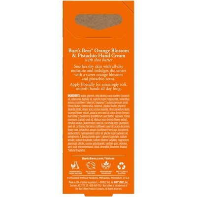4 Tubes ? BURT?S BEES ALL DAY MOISTURIZATION: With the aromatic scent of orange blossom pistachio, Burt?s Bees shea butter hand cream is a luxurious, moisturizing cream that nourishes dry hands; Package may vary ? NOURISHING INGREDIENTS: Formulated with moisturizing ingredients such as shea butter, baobab and pumpkin seed oils, Burt?s Bees 99% natural origin orange blossom and pistachio hand cream for smooth hands ? APPLICATION: Apply Burt?s Bees shea butter hand cream after an evening shower or during the day for soft hands, a non-greasy feel and pleasant botanical scents of orange blossom and pistachio ? CONVENIENTLY SIZED: Perfectly sized for storing in a purse or make up kit, traveling on-the-go or keeping in your car, treat dry skin by applying Burt?s Bees orange blossom and pistachio hand cream ? ABSENCE OF NEGATIVES: Dermatologist-tested, Burt?s Bees orange blossom and pistachio hand cream is formulated without parabens, phthalates, SLS, petrolatum or synthetic fragrances