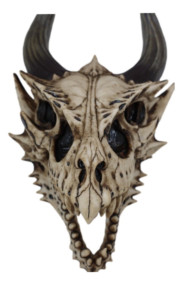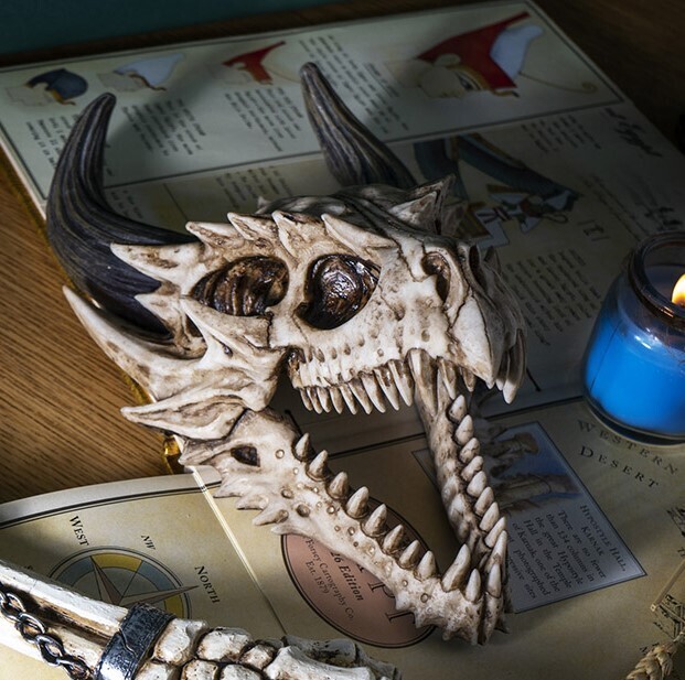 ? This Skeleton Dragon Head Fossil-like Sculpture is made of designer resin and intricately sculpted with attention to detail.