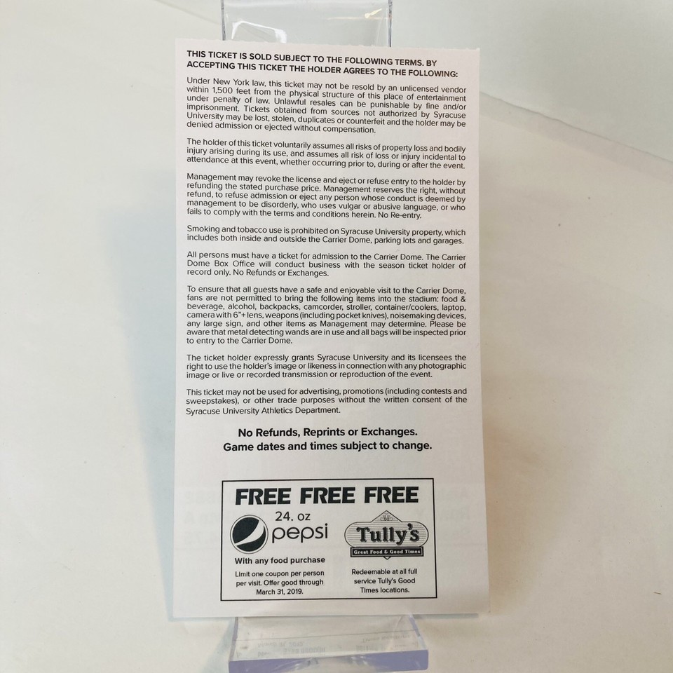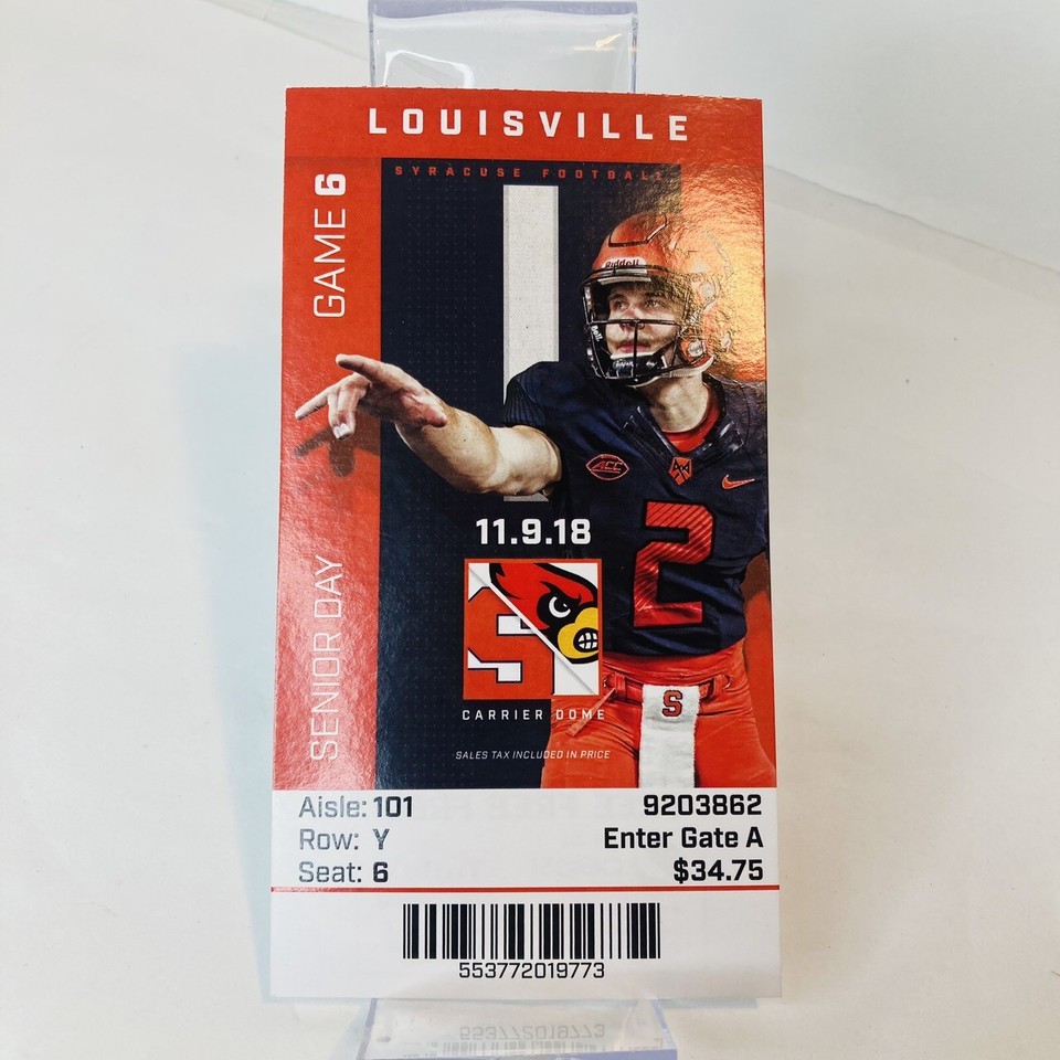 Nice clean condition- used. From 11/9/28 NCAA Syracuse Orange vs Louisville Family Senior Day Game 6. Carrier Dome Sec 101 Row Y Seat 6. Features #2.