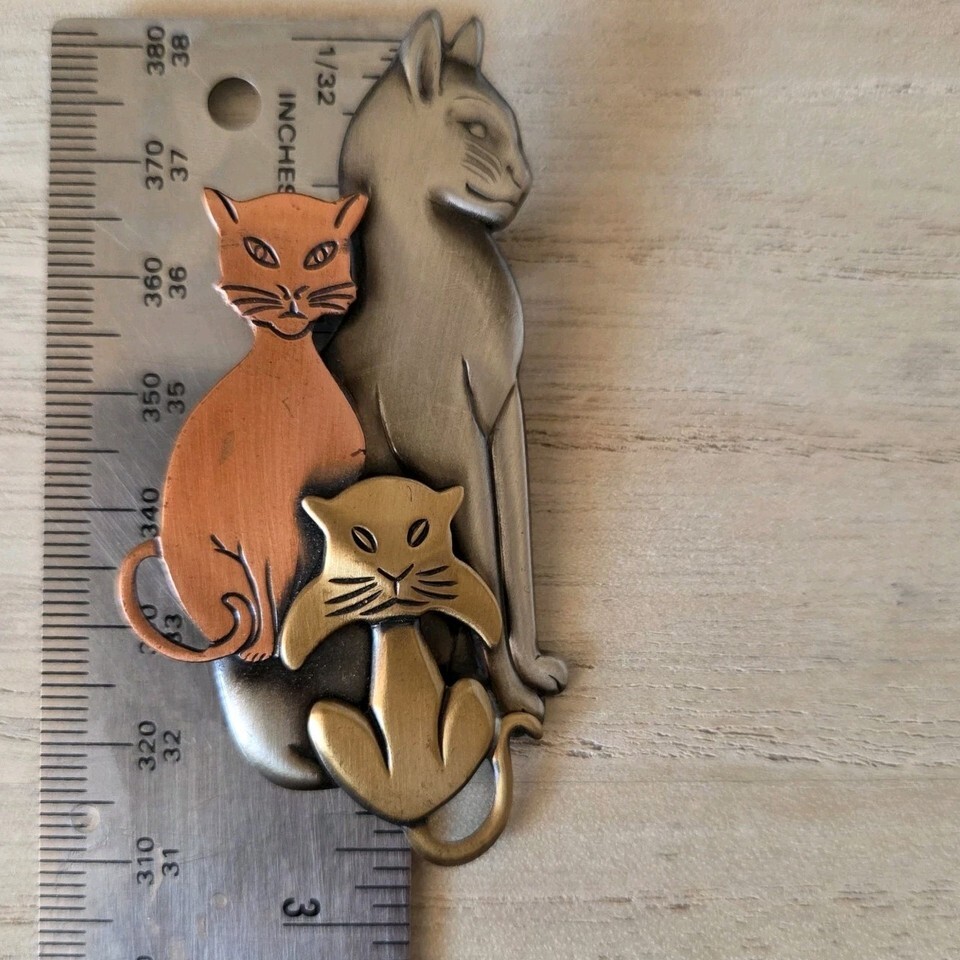 This vintage tri-color cat brooch pin features a unique design in silver, copper, and brass tones, making it a standout piece of jewelry. Measuring 2 7/8" x 1 3/8", this brooch is crafted from metal and does not feature any main stone colors. The intricate detailing and combination of colors give this brooch a classic yet stylish look, perfect for adding a touch of vintage flair to any outfit.