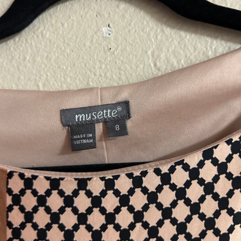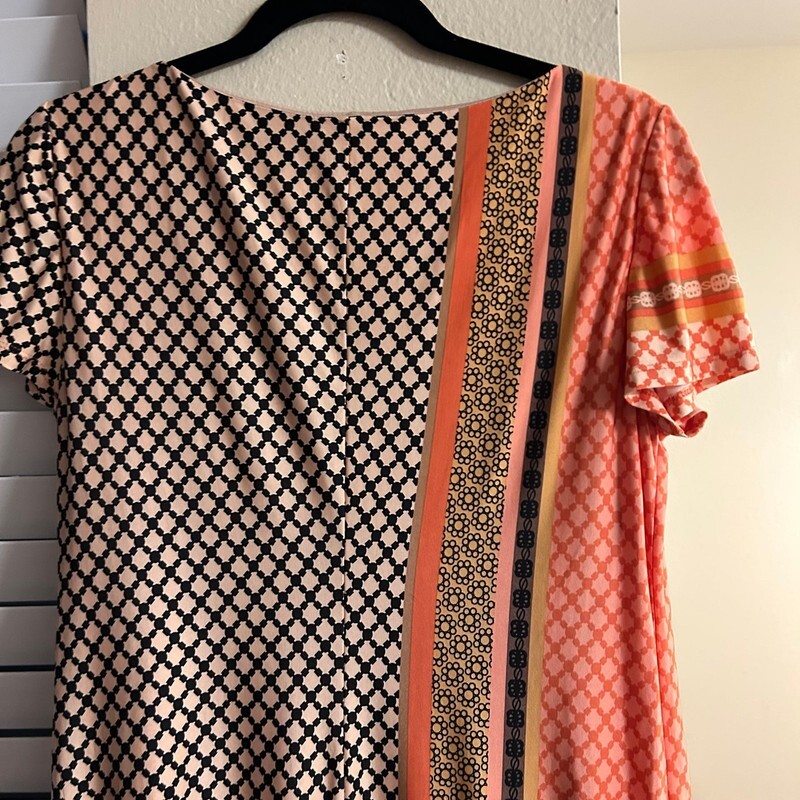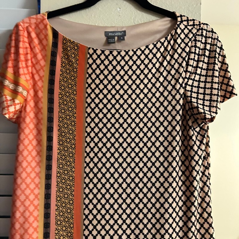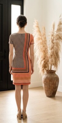 short-sleeved shift dress features bold geometric and ornamental patterns in orange, black, and white. It appears to be a knit or stretch-blend fabric, possibly from brands like Max Studio or Musette, known for similar printed shift dresses.fully lined