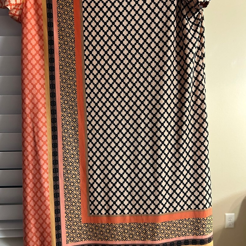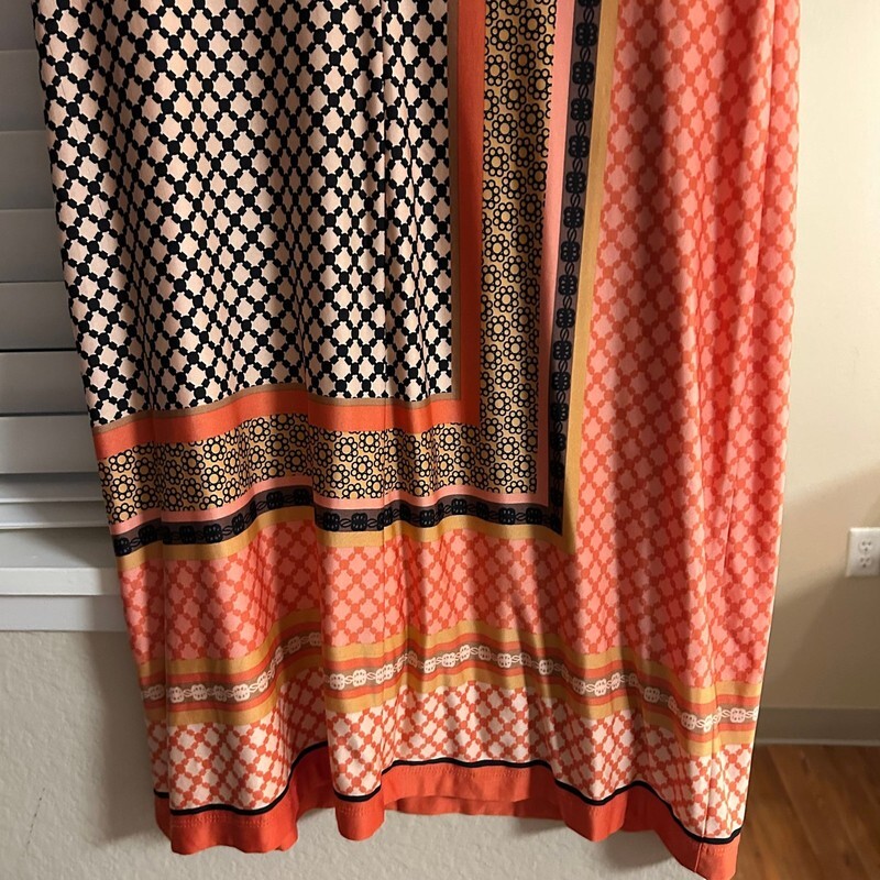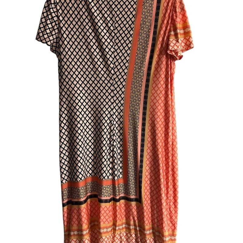 This stunning maxi dress features a vibrant geometric print in shades of orange, black, and white. The short sleeves and flowing silhouette make it perfect for comfortable everyday wear or a casual outing. Excellent pre-owned condition with no visible flaws.