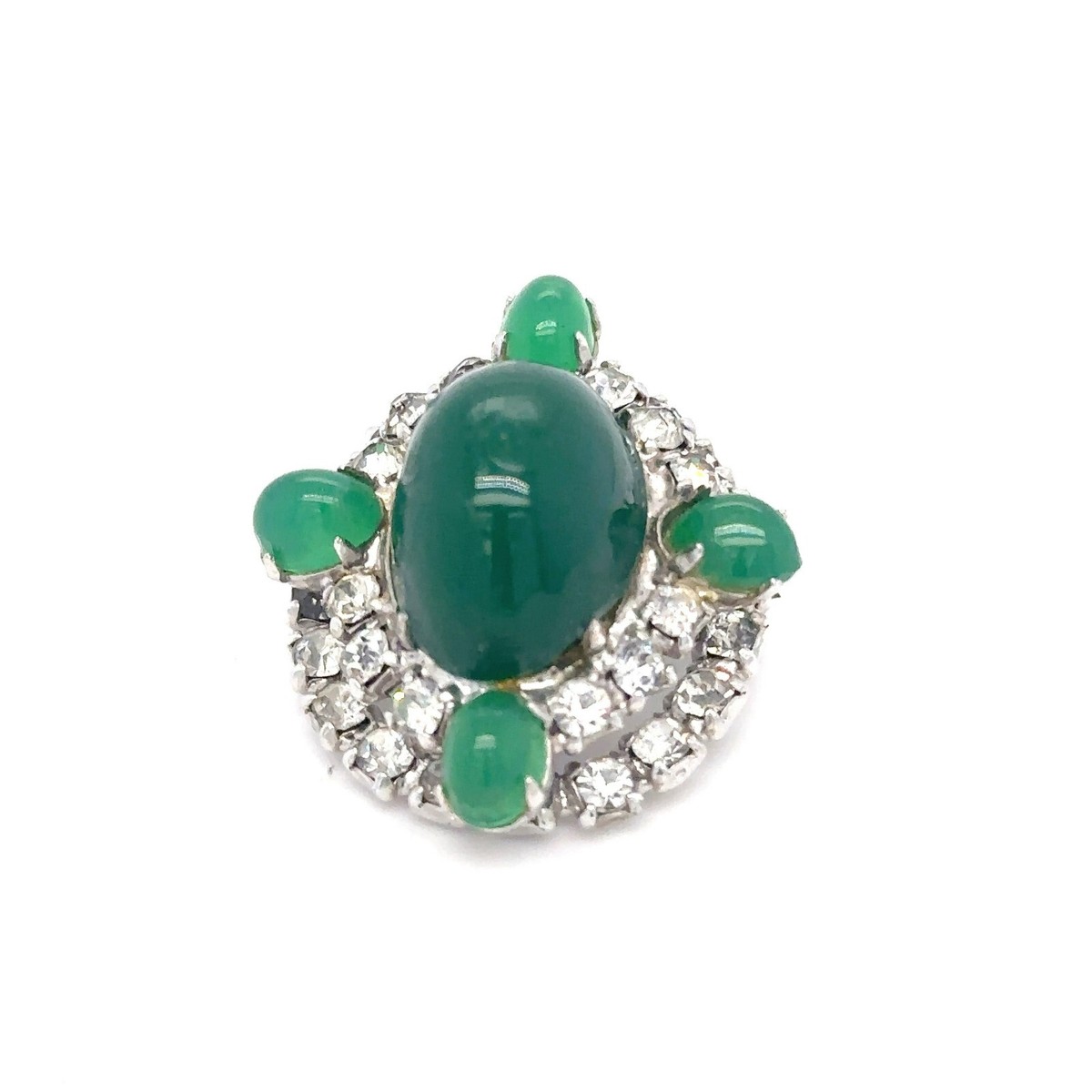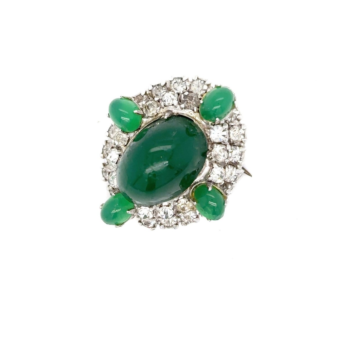 Brooch with stick pin closure featuring large faux cabachon jade piece accented by four additional green stones and rhinestones.