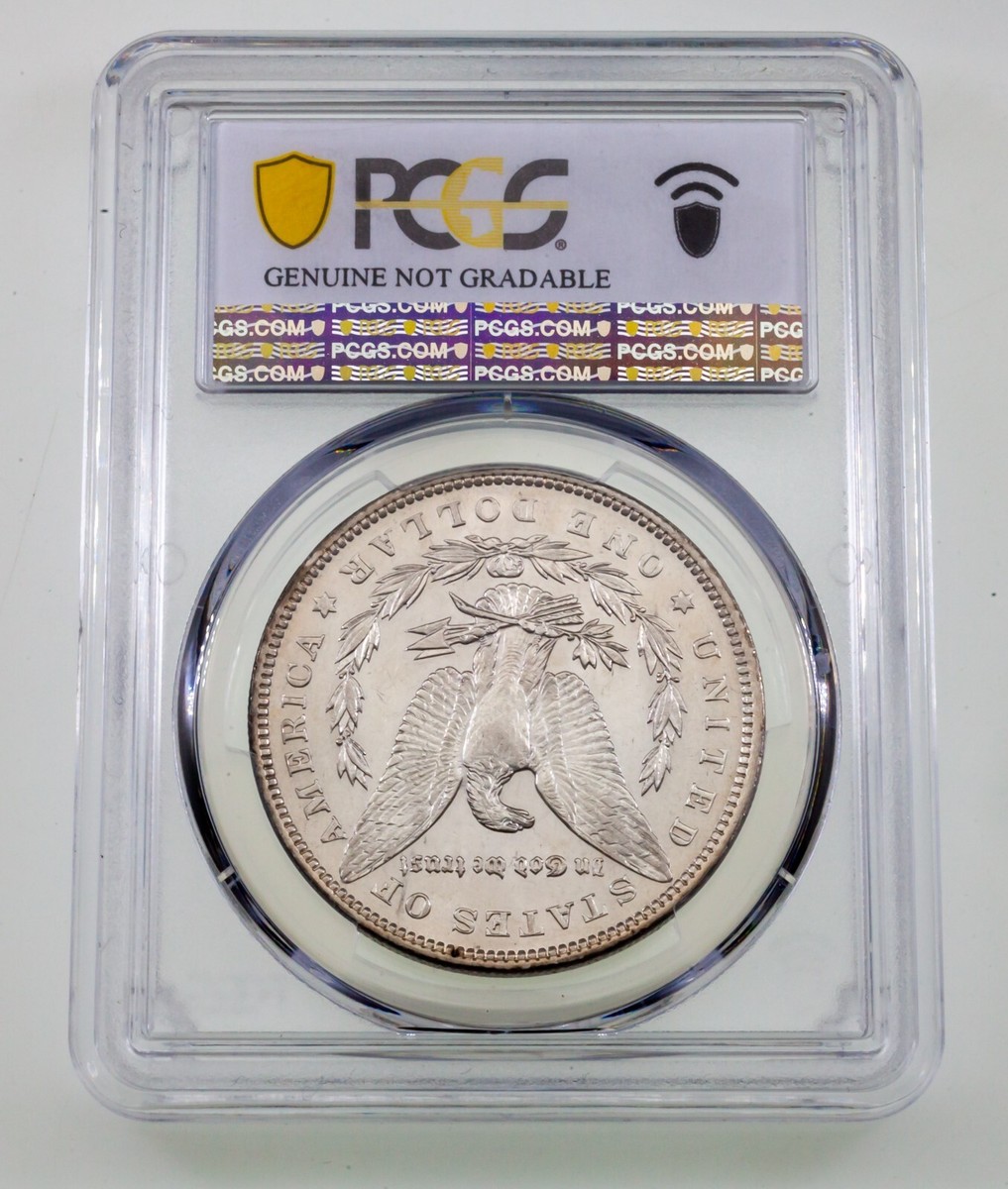 1885 Silver Morgan Dollar Graded by PCGS as Genuine UNC Details - Lacquer