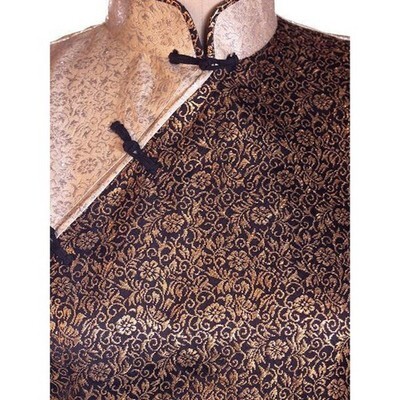 Metallic rayon damask in gold-copper tones; white and silver satin panels; fully lined in white acetate. Black satin frog closures.