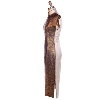 This exquisite early 1950s cheongsam-style wiggle dress captures the elegance of the post-Korean War era, when Asian-inspired silhouettes were the height of Hollywood chic. The gold-copper metallic damask front shimmers with dimensional texture, offset by soft silver-white satin panels at the neckline and back. Its sleek hourglass cut celebrates mid-century femininity ? demure yet utterly figure-flattering.