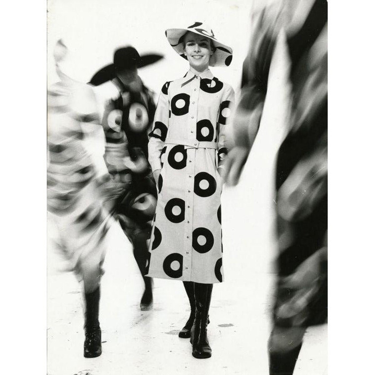 Vuokko Nurmesniemi, one of Finland?s most celebrated designers, was a principal at Marimekko in the 1950s?60s before launching her own label. Known for bold prints and architectural silhouettes, Vuokko?s designs are now considered museum-worthy examples of Scandinavian modernism. This dress/coat, with its oversized op art circles and innovative A-line cut, reflects her signature mix of playfulness and precision. Collectors worldwide prize Vuokko pieces for their artistry and rarity.