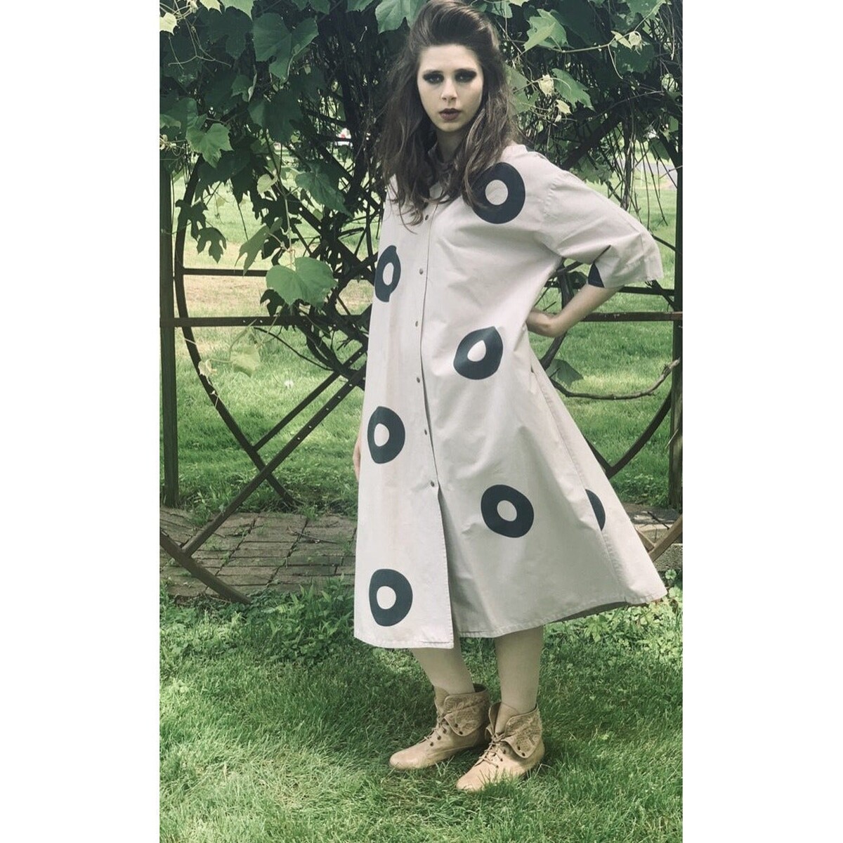 Vintage Vuokko heavy cotton dress/coat in beige with iconic dark gray op art circle pattern. Features a roomy A-line silhouette, side seam pockets, elbow-length sleeves, and silvery snap closures down the front. Designed to be worn as either a dress or coat, this piece embodies Scandinavian modernism and is both rare and collectible.