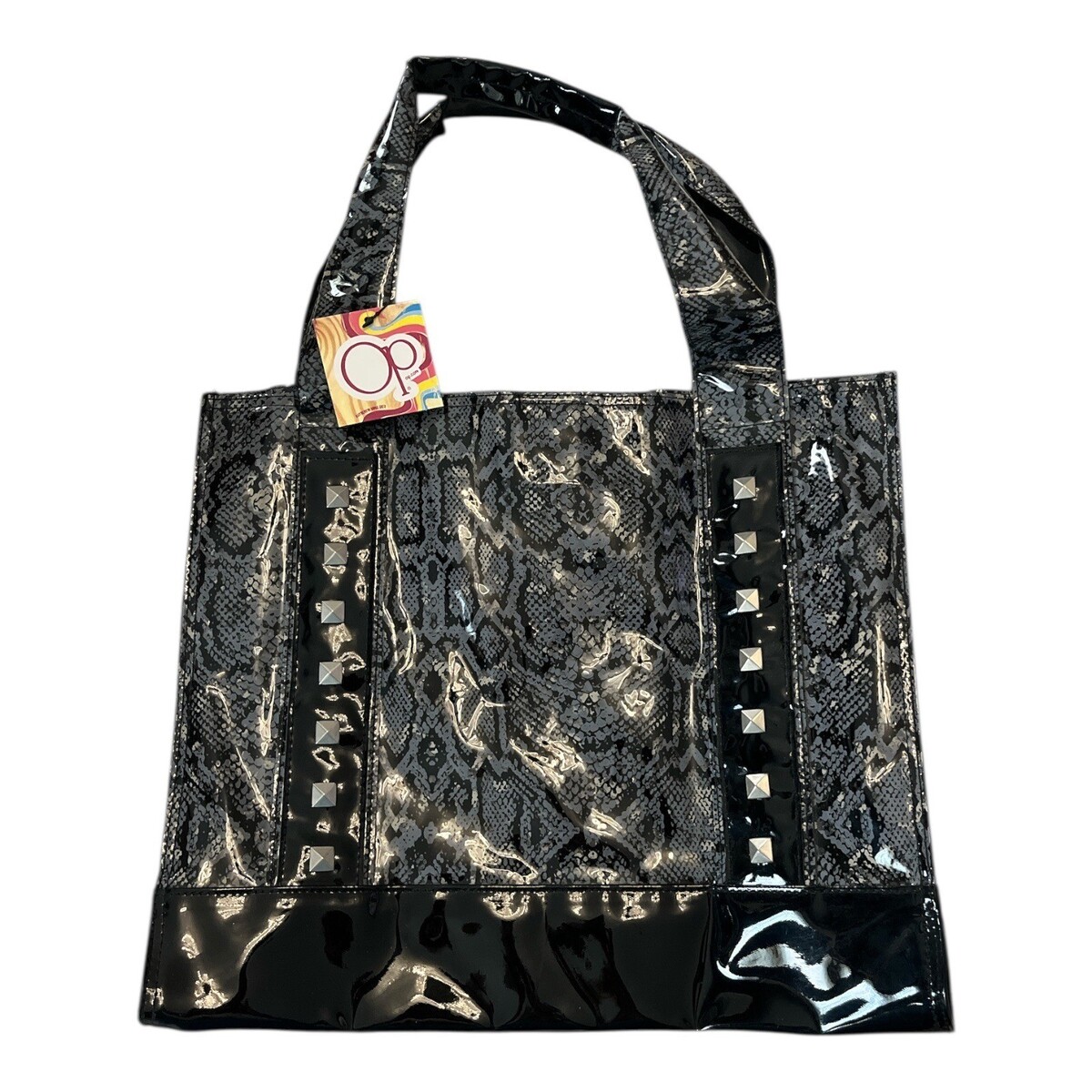 Bold statement tote bag by OP featuring a glossy black patent-style finish with a gray snake print pattern. The front is accented with vertical patent trim and silver-tone pyramid studs for an edgy look. This roomy tote offers plenty of space for everyday essentials and works well for casual wear, travel, or work.