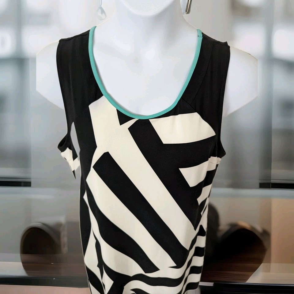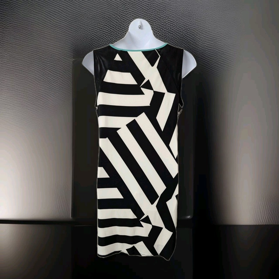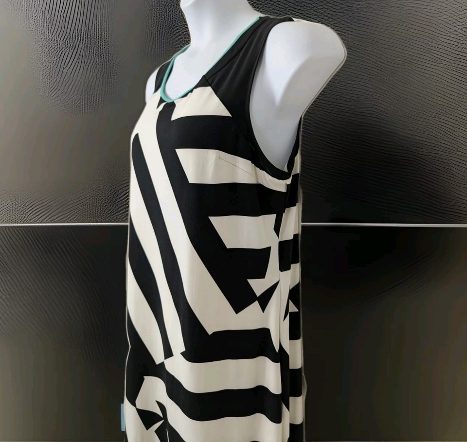Women's sleeveless geometric print dress. Size medium. Body 93% polyester, 7% spandex. Lining 100% polyester. Black and White with green trim.