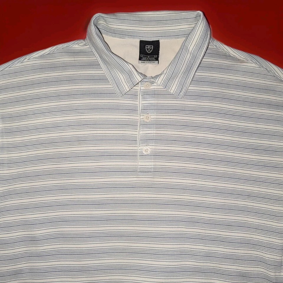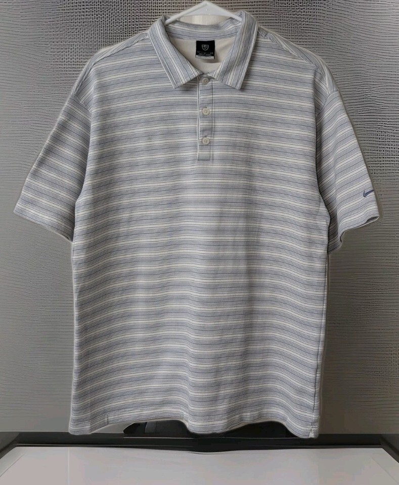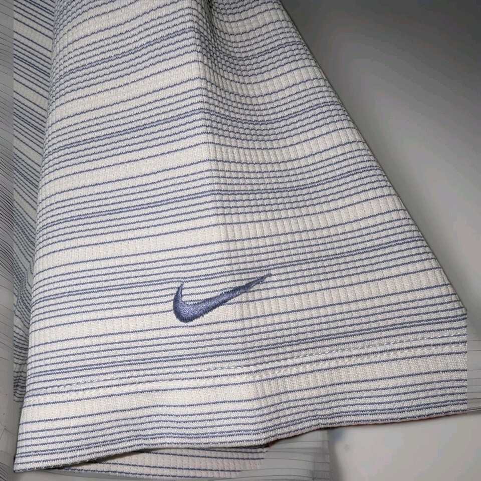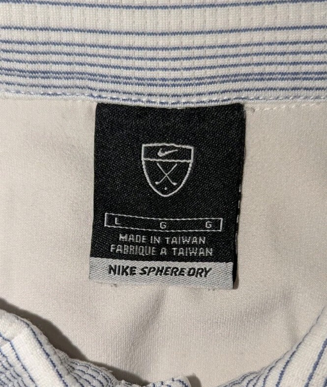 NIKE GOLF Sphere Dry Striped Polo Shirt White and Blue SZ Large 100% Poly. Condition is Pre-owned - Excellent. Shipped with USPS Ground Advantage.