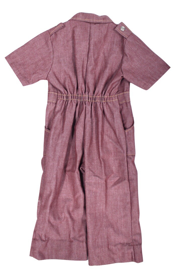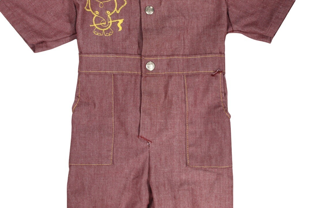 Toddler jumpsuits like this were staples of midcentury children?s wardrobes, blending durability with charm. Embroidered motifs, like the cheerful elephant here, were popular in the 1950s?70s for adding a playful touch to practical clothing. Today, these pieces are collected as heirloom keepsakes, photo props, or nursery displays as well as worn by little ones.