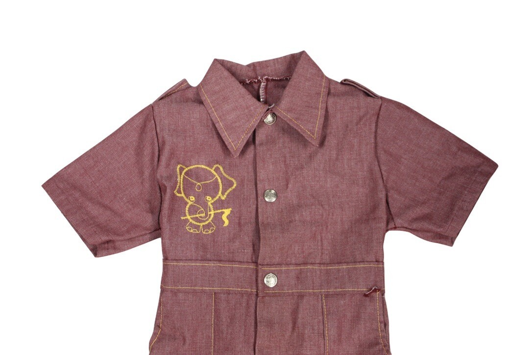 Raspberry denim cotton blend, yellow stitching, yellow embroidered elephant, snap closures, elastic at back waist, 1950s?70s