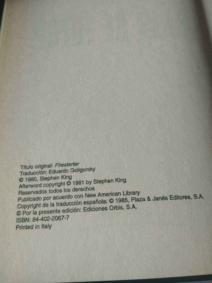 Ojos de Fire Stephen King 1985 Orbis Fabri - LIVRE Espagnol Am