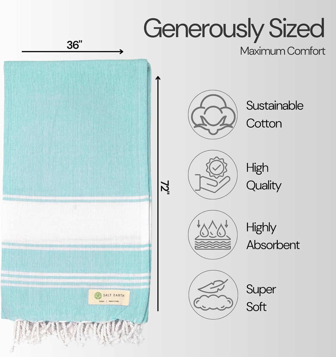 Set of 4 Lightweight Cotton Beach Towels - Aqua, Quick Dry & Sand Resistant