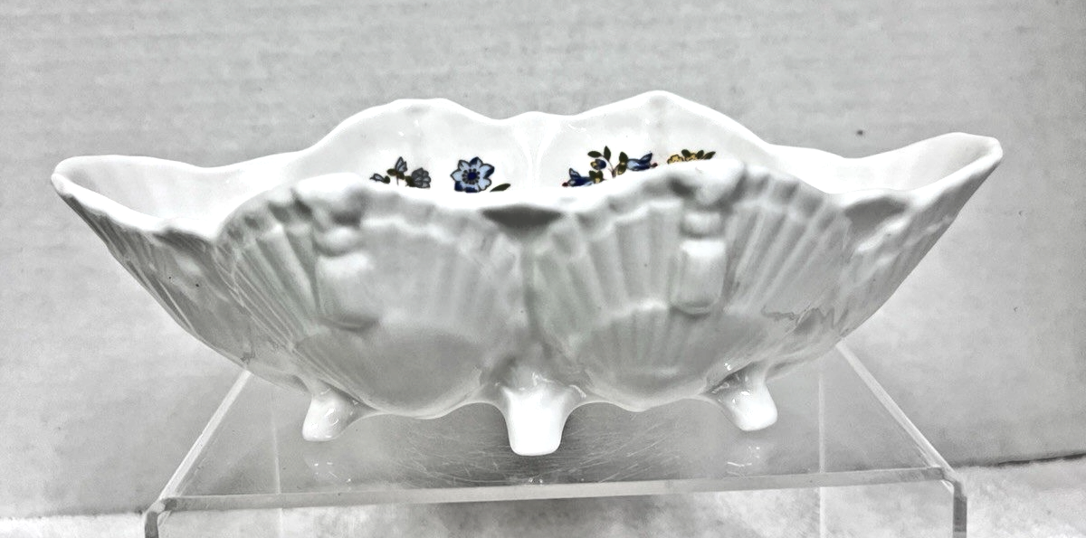 Aynsley Bone China Cottage Garden Oblong Footed Scalloped Candy Dish Serving Bowl. Footed oblong serving bowl candy dish measures approx. 8 3/8" long, 4 1/2" wide, and 2 3/4" tall/deep has a clam shell patterning to the outside of the piece, no damage or signs of use, clear bright colors. See pictures.