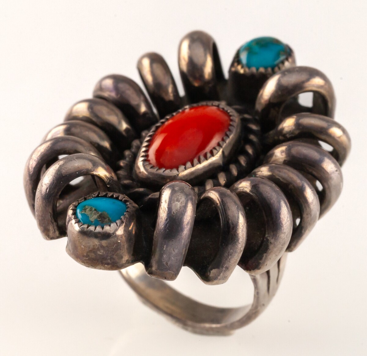 Vintage Navajo Sterling Silver Turquoise Coral Ring Sz: 6.50