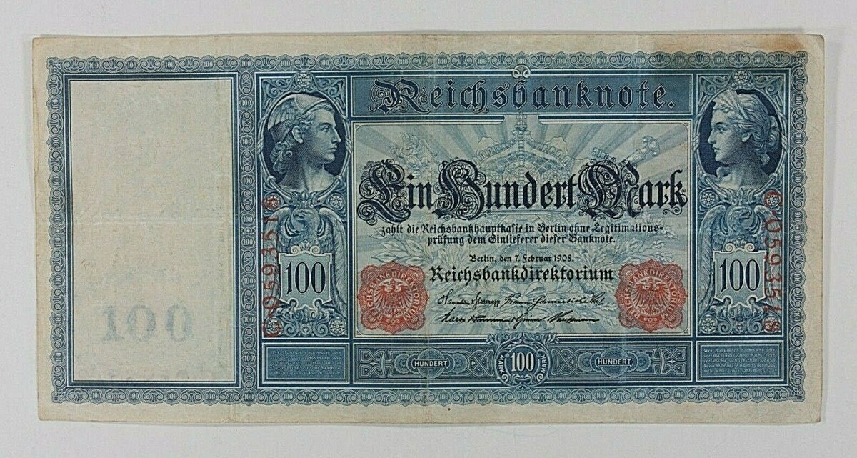 1908 Germany 100 Mark Reichsbanknote // Armored Germania with Sword Shield