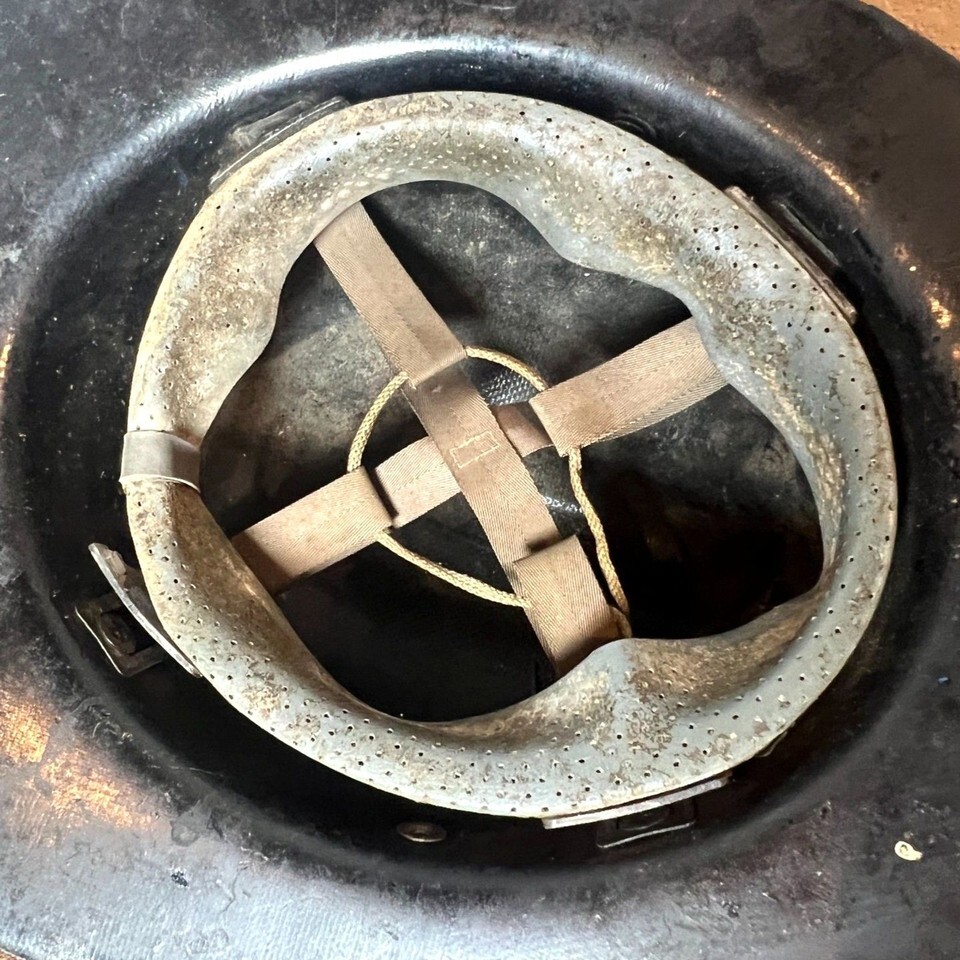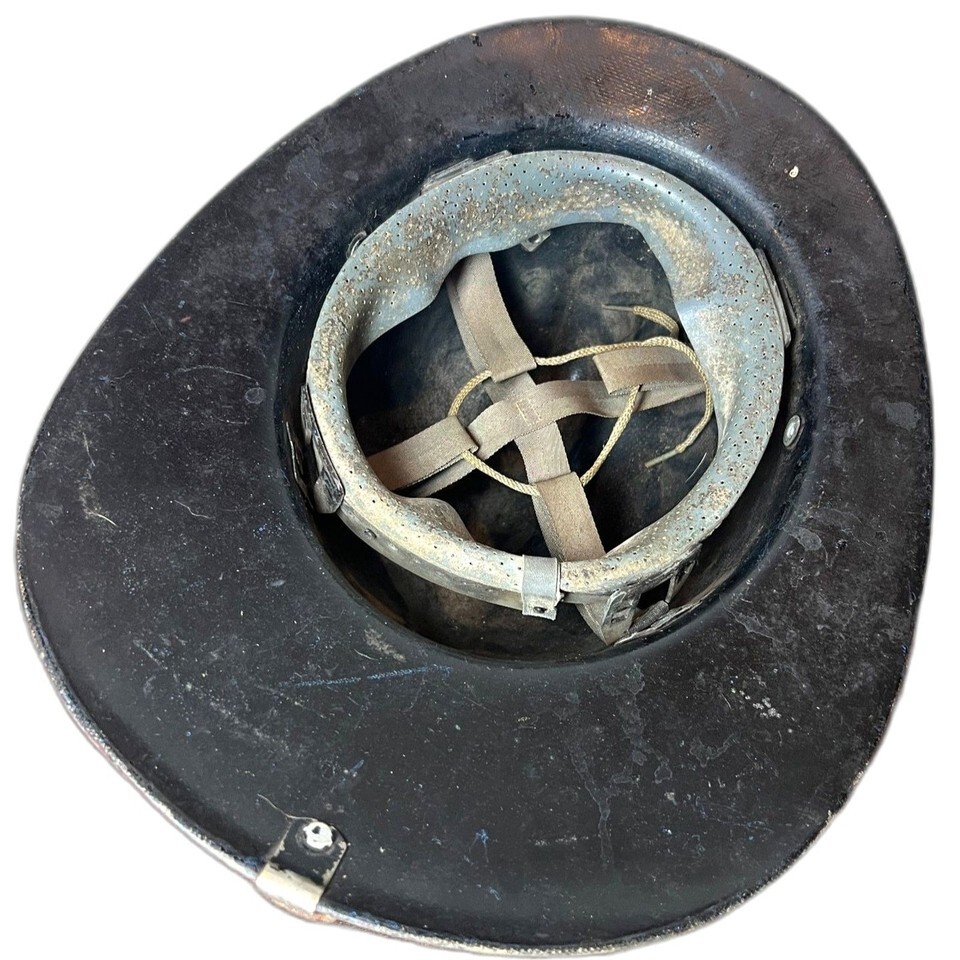 The fiberglass shell has retained its original shape well, with age-appropriate surface wear, paint loss, and cracking from what appears to be many years of use. This helmet shows fireground wear, crazing, damage, and patina consistent with real service use. The liner and suspension are intact, which is usually hard to find. The leather shield remains legible with visible crazing and wear, and appears original to the helmet.