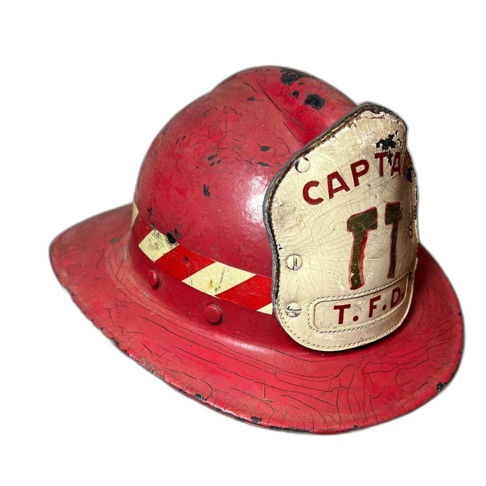 Vintage fiberglass leather firefighter helmet, estimated to be from the 1960s-1980s, featuring an original hand-painted leather front shield marked ?CAPTAIN T.F.D.?