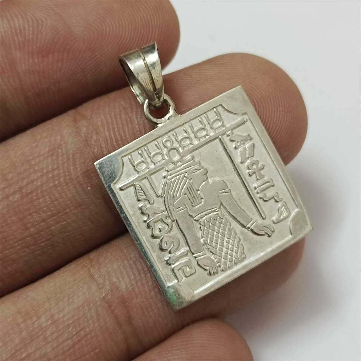 This 900 silver Egyptian pendant is a unique and handmade piece featuring a pharaoh queen design with hieroglyphs, adding a touch of vintage artistry. The square-shaped pendant is crafted with a brilliant cut and is ideal for special occasions like anniversaries or birthdays. Made with high-quality silver and Egyptian craftsmanship, this charm pendant is a stylish addition to any jewelry collection. The pendant is stackable and embodies a theme of art, making it a standout piece for women who appreciate historical and cultural influences in their accessories.