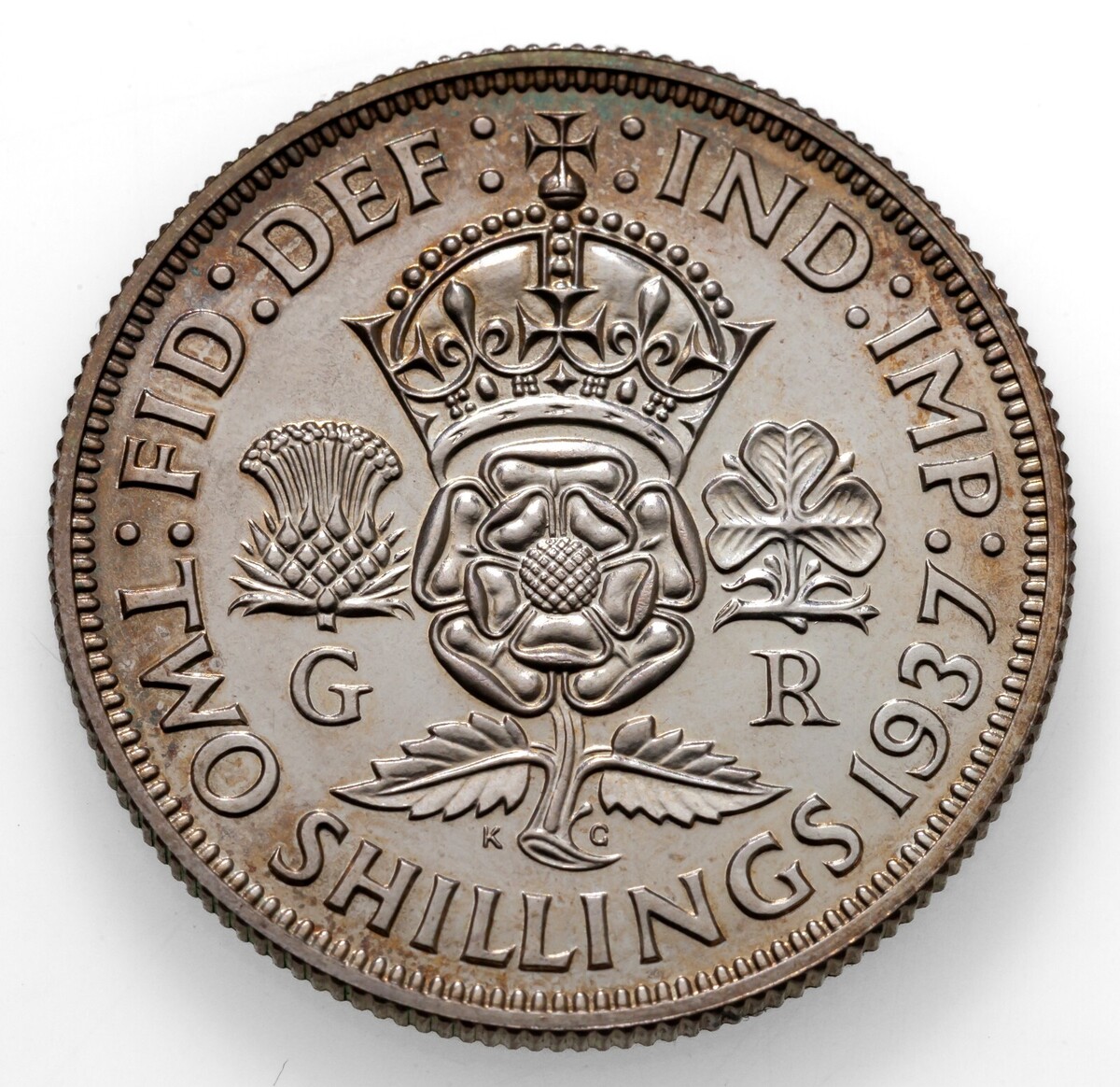 Reverse: Crowned tudor rose with a thistle and letter G below to the left side of the rose and to the right side a shamrock with the letter R below