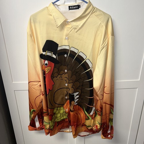 Thanksgiving Turkey Mens Long Sleeve Shirt Size 2X Atlani Holiday Double Sided. Condition is Pre-owned. Shipped with USPS Ground Advantage.