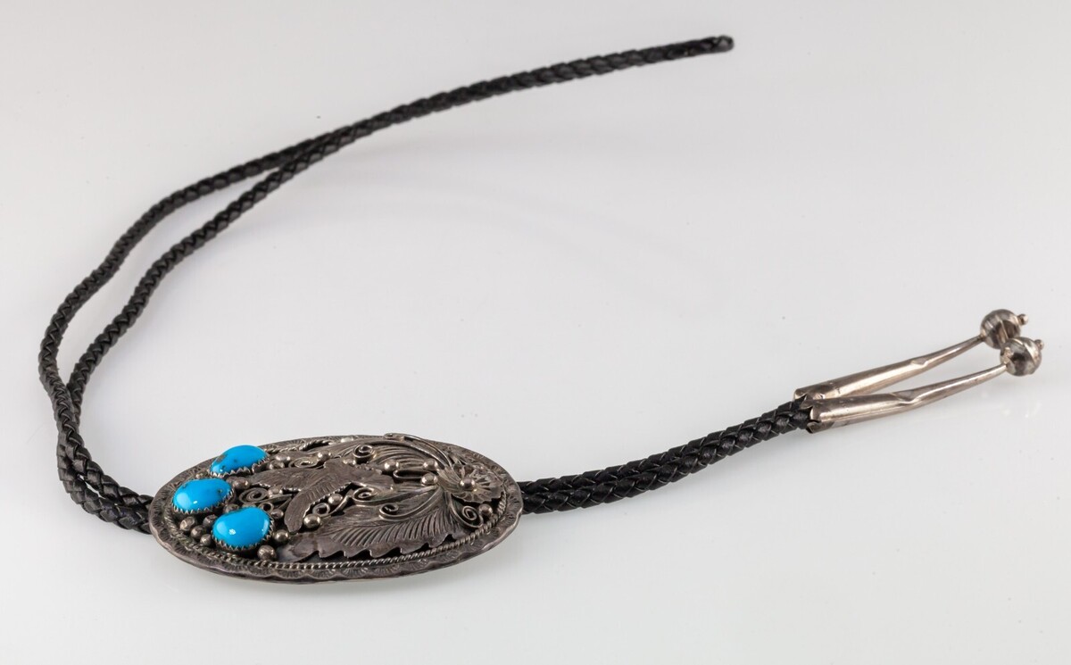 Sterling Silver Ornate Sculpted silver Bolo Tie with Turquoise Accents Leather