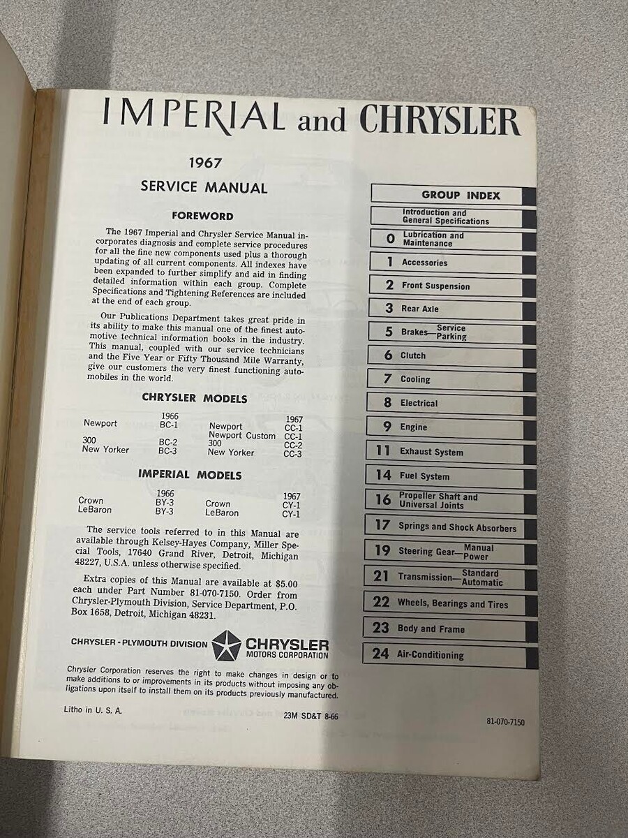 1967 Chrysler 300 Imperial New Yorker Newport Service Shop Repair Manual