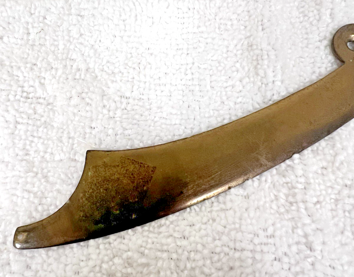 Vintage Bronze Brass Camel Figural Embossed Dessert Scene Sword Letter Opener. Top of sword shaped letter opener or decorative item has a figural camel head and neck, on the sword blade is an embossed old dessert house palm trees, end of approx. 8" long sword appears tip broken polished smooth or never had a tip? Camel paint in very good condition, some wear to coloring on embossed blade. See pictures.