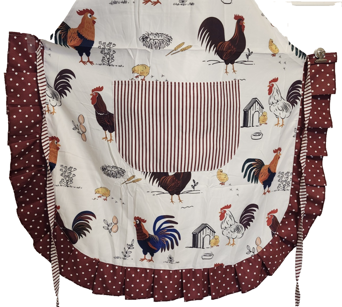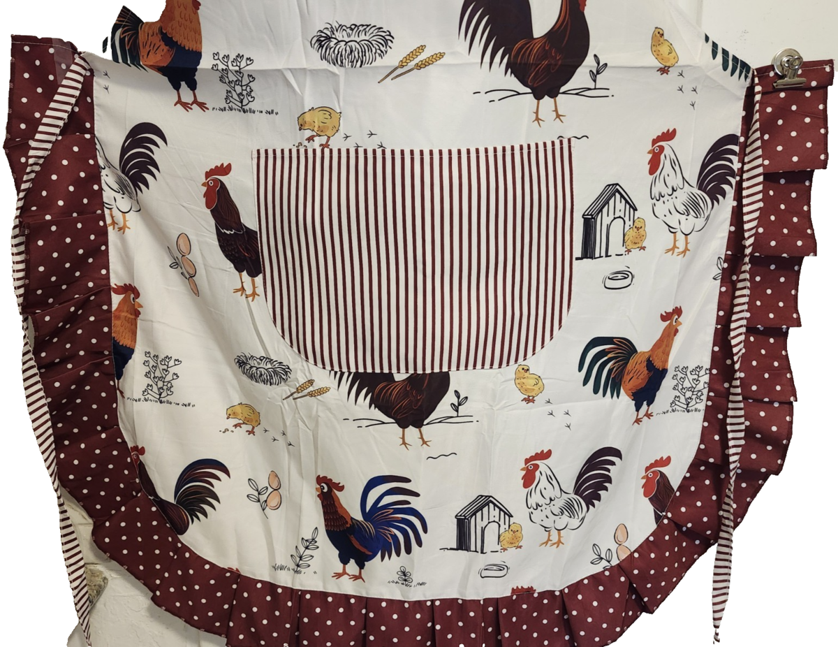 Apron with rooster pattern is a large, multicolored cloth apron perfect for all occasions. The apron features a country style design and is machine washable for easy cleaning. It is unisex and one size fits all, making it suitable for both men and women who enjoy cooking or working in the kitchen. The rooster pattern adds a touch of charm to the apron, making it a unique and functional addition to any home chef's collection. SMOKE AND PET FREE HOME