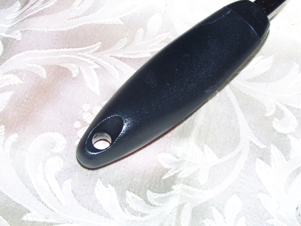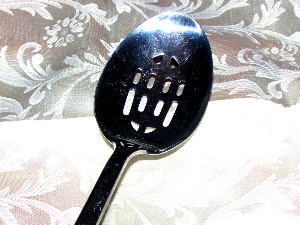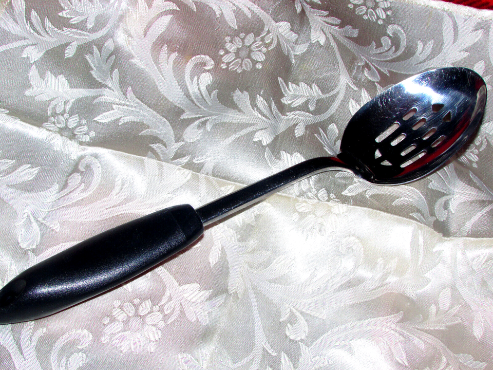 SPOON SLOTTED serving 13" long stainless black plastic handle hanging (hall )