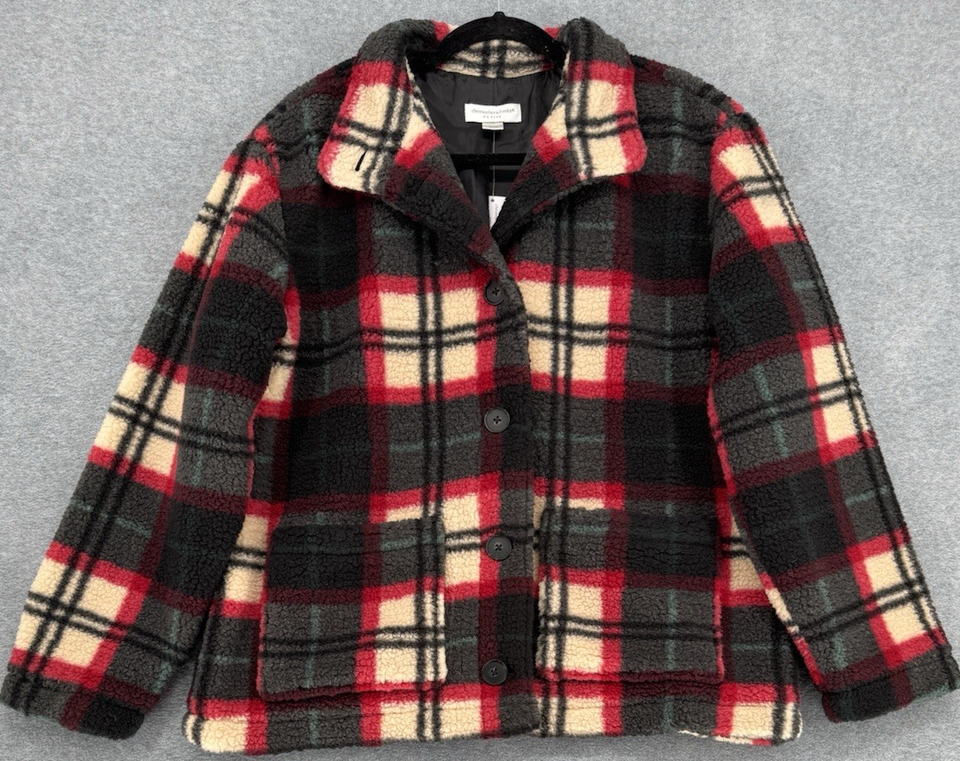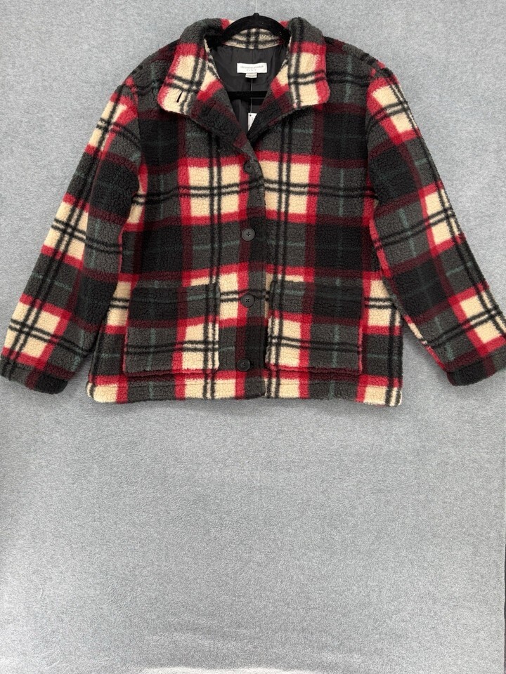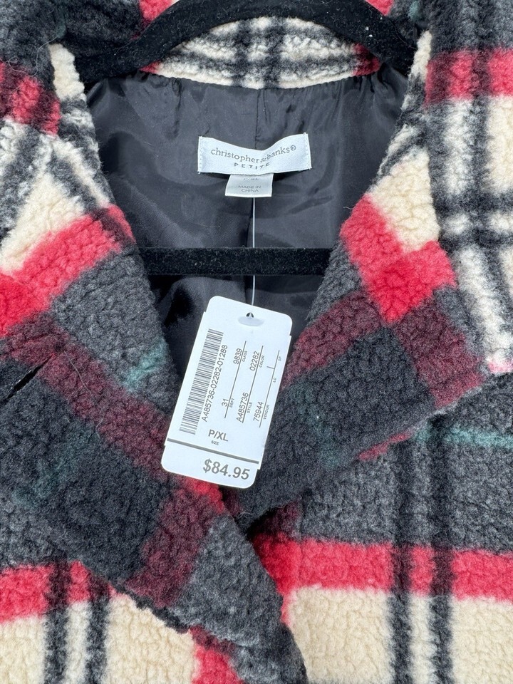 Plaid Sherpa Fleece Jacket Women’s Petite P/XL Button Front Cozy Coat NWT