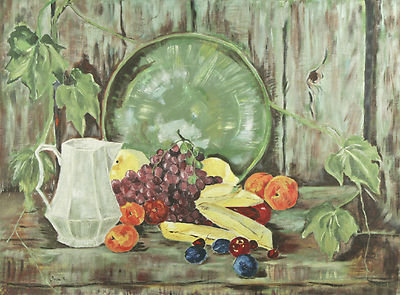 Natura Morta (Brocca E Frutta) Di Ira K. Firmata Olio Su Tela 18"x24"