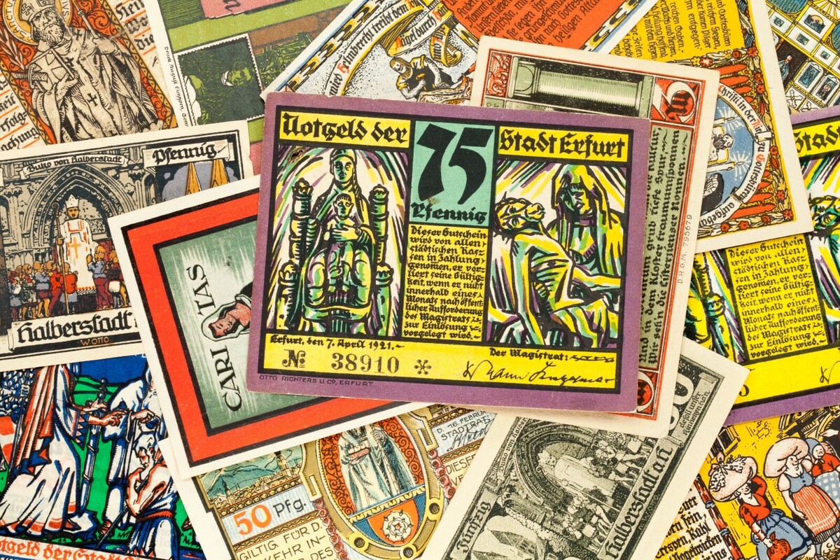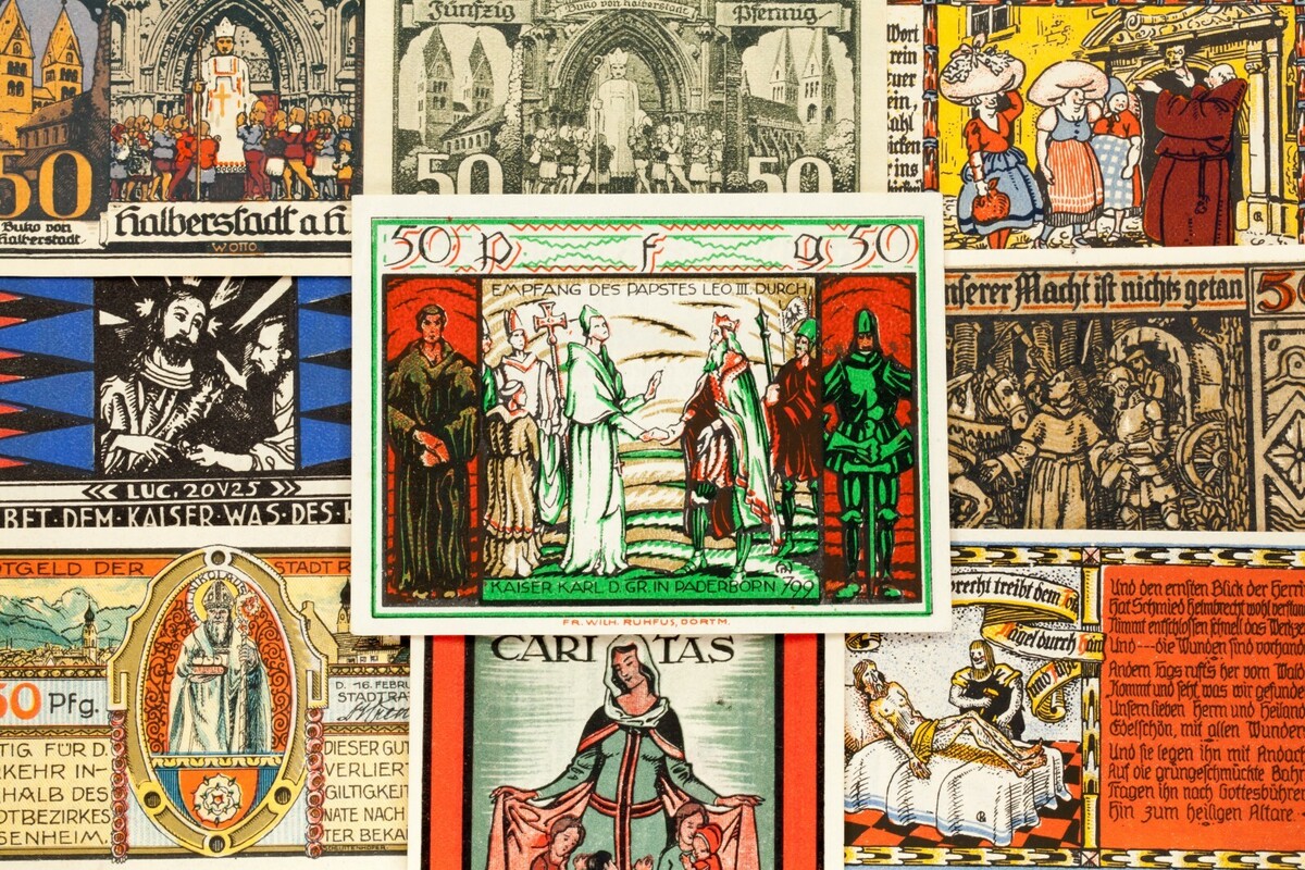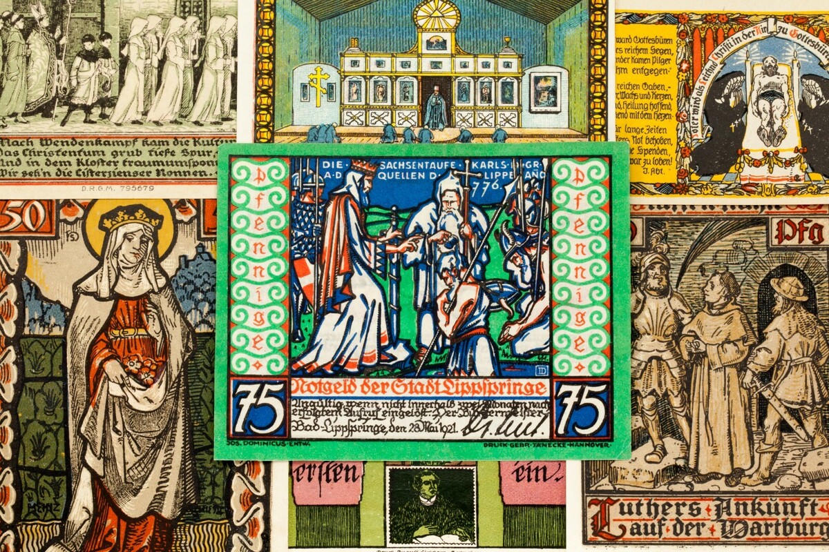 Este lote incluira 20 billetes notgeld individuales de Alemania despues de la Primera Guerra Mundial. Todos estaran en condiciones de muy fino a sin circular (VF-UNC). Valores de cara entre 5 pfennig a 5 marca. Tema religioso.