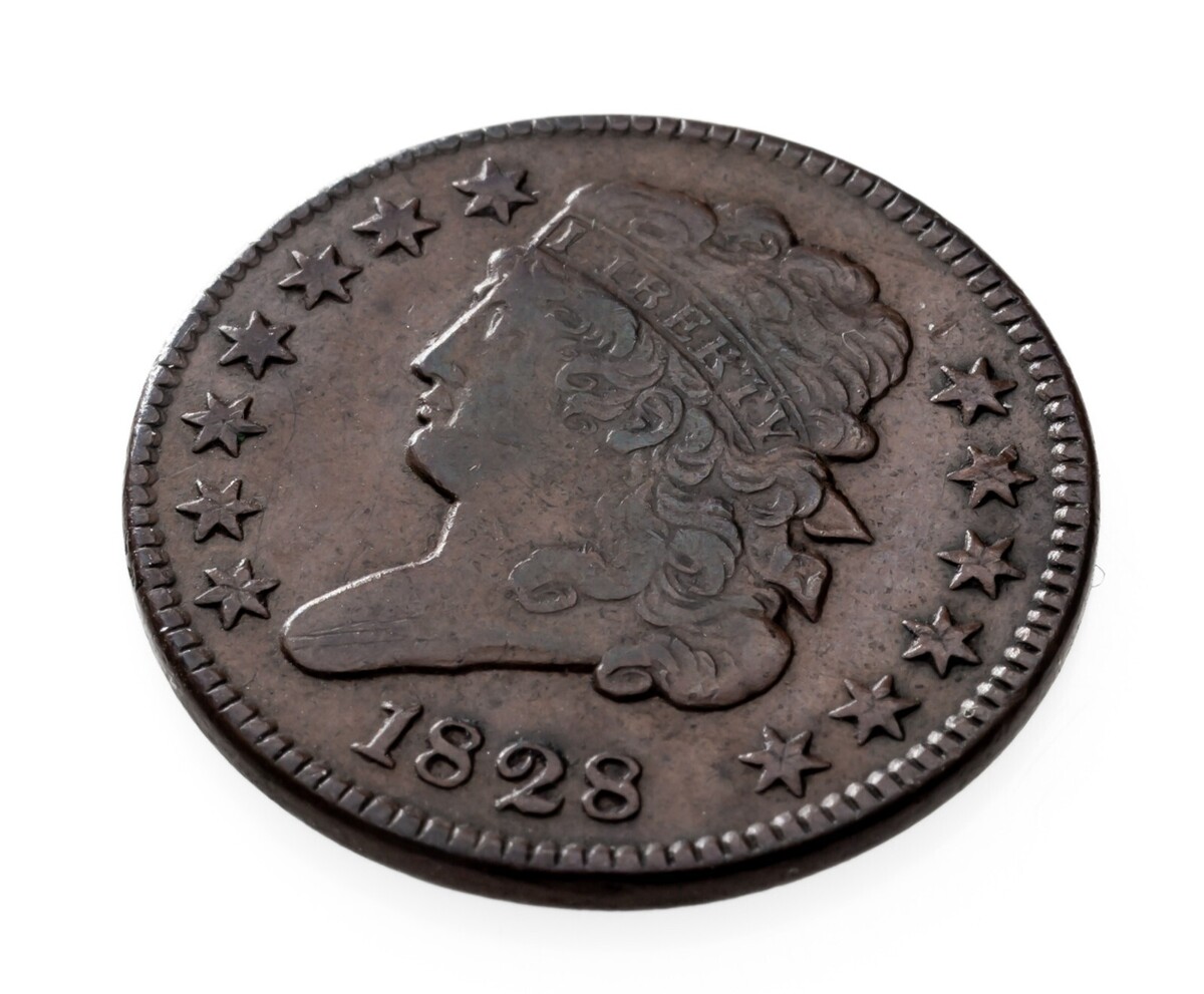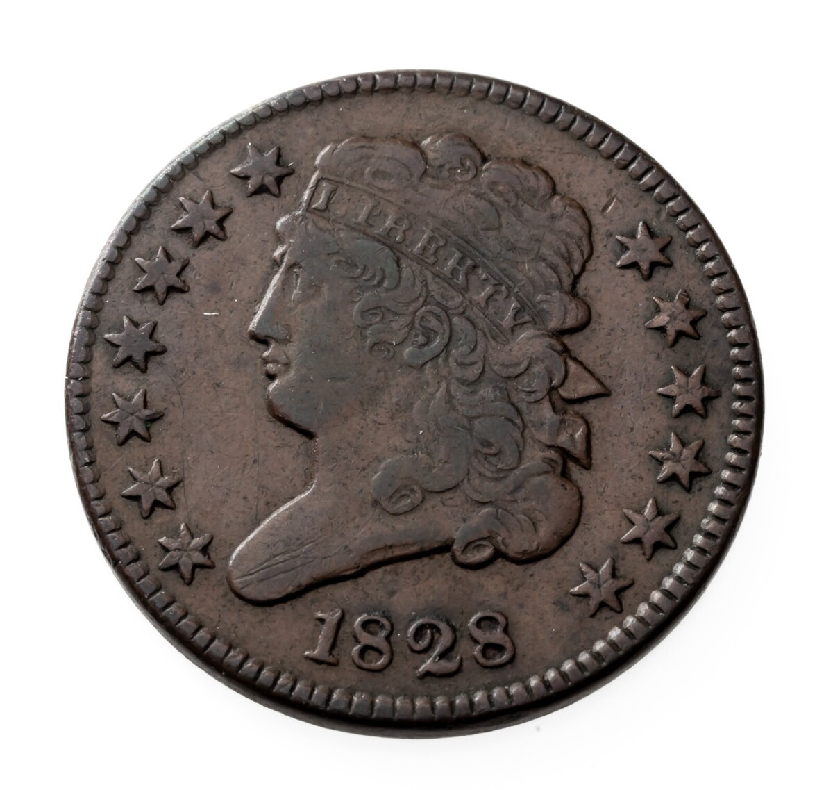 1828 13 Stars medio centavo en muy buen estado VF, color marron, ¡bonito detalle!