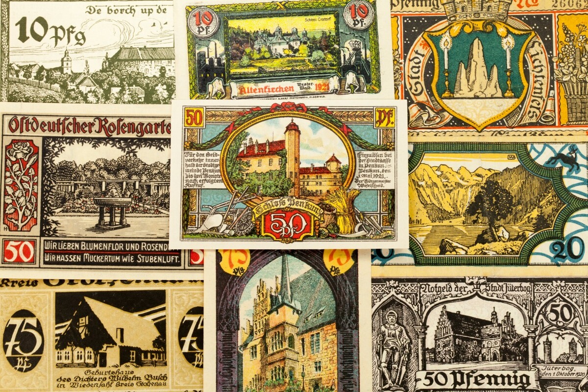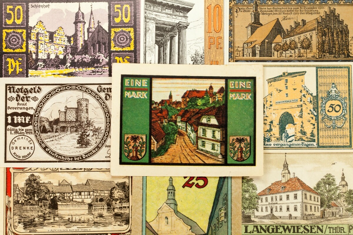 Este lote incluira 25 notas individuales de Notgeld de Alemania despues de la Primera Guerra Mundial. Todos estaran en la condicion muy fina a no circulada (VF-UNC). Valores de cara entre 5 pfennig a 5 marca. Tema de vistas de la ciudad; monumentos, edificios y paisajes. No hay duplicados.