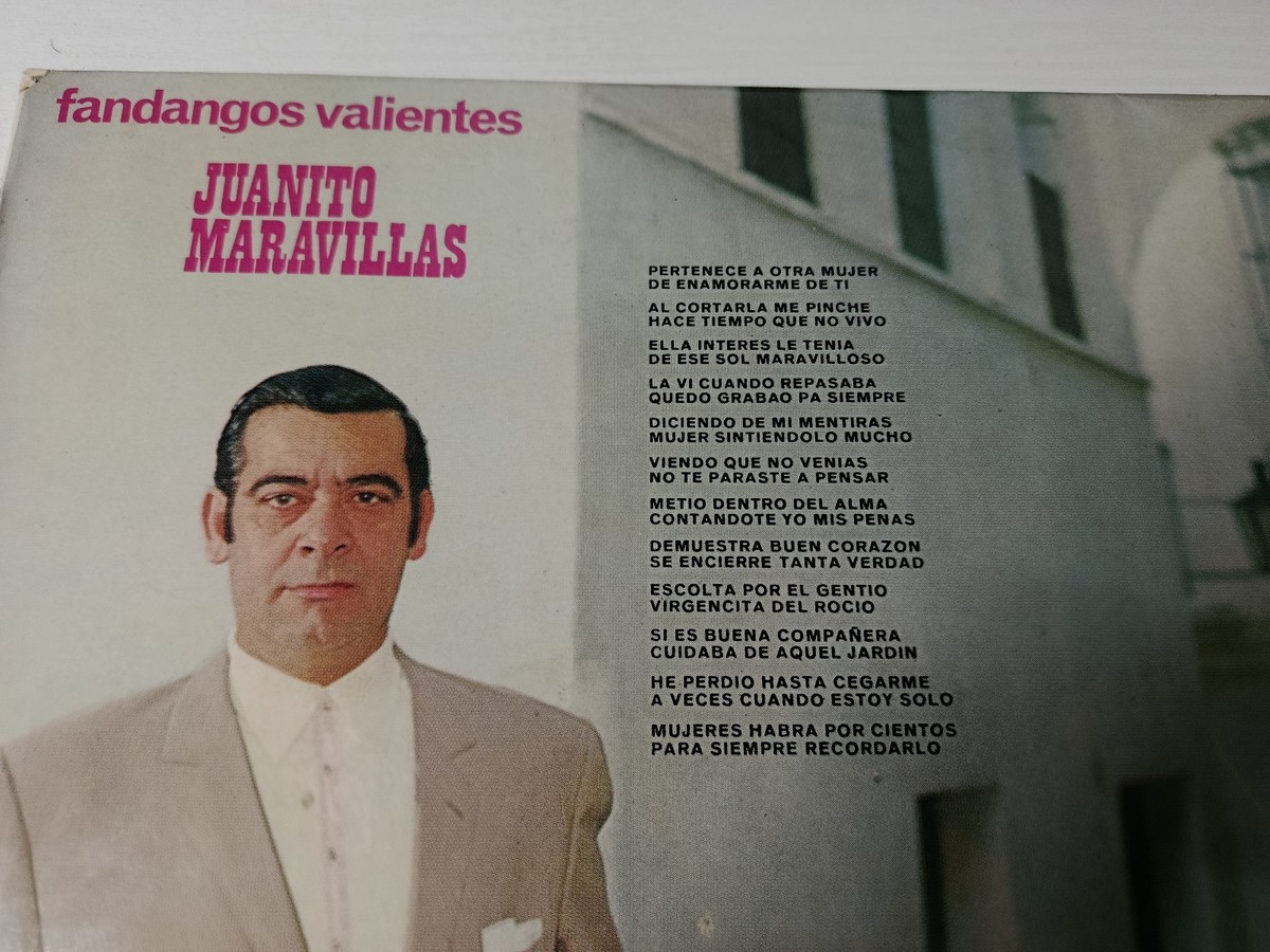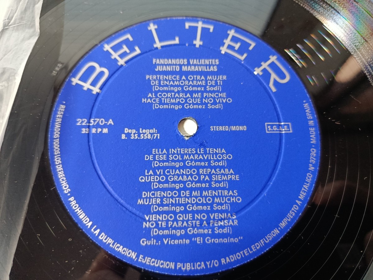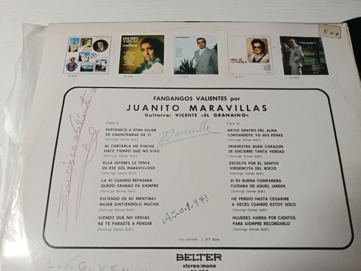 Original Belter edition de 1971, Brave Fandangos es uno de los most personal and emotional works de Juanito Maravillas, where he deploys his characteristic voice in a series de fandangosde intimate and popular theme. This copy stands out de special way for including authentic signature de Juanito Maravillas on the back cover, written in azul and red pen, con annotations added by its original owner in 1973.