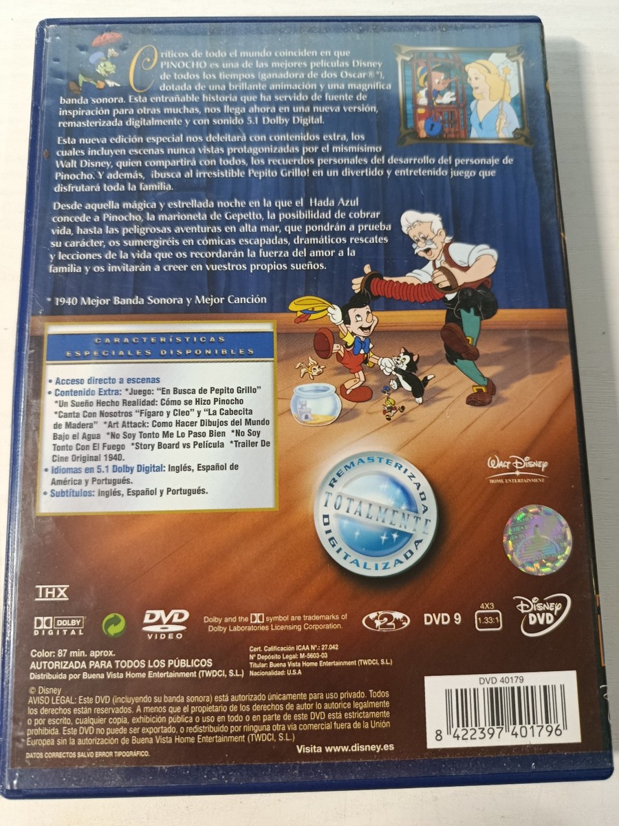 Fully remastered Special Edition del de classic Pinocchio, winner de dos Oscars in 1940 (mejor Soundtrack andmejor Song). This DVD version offers a renewed image and sonido , along with interactive extras and documentaries que allow you to discover how this endearing film was created.historia . A fundamental piece para collectors de Disney classics and loversde traditional animation.