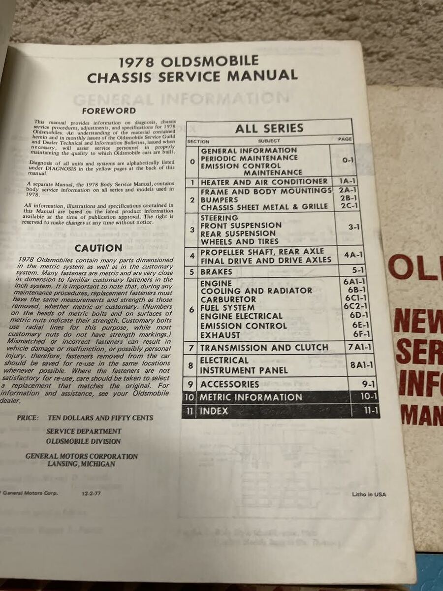 Full of information and illustrations, covers everything, step by step instructions, assembly/disassembly, exploded illustrations/diagrams/troubleshooting, great manual to have when owning/servicing a OLDS and will be a great aid to keep your OLDS on the road. These manuals will save you money in repairs/service. A must have if you own one of these vehicles.