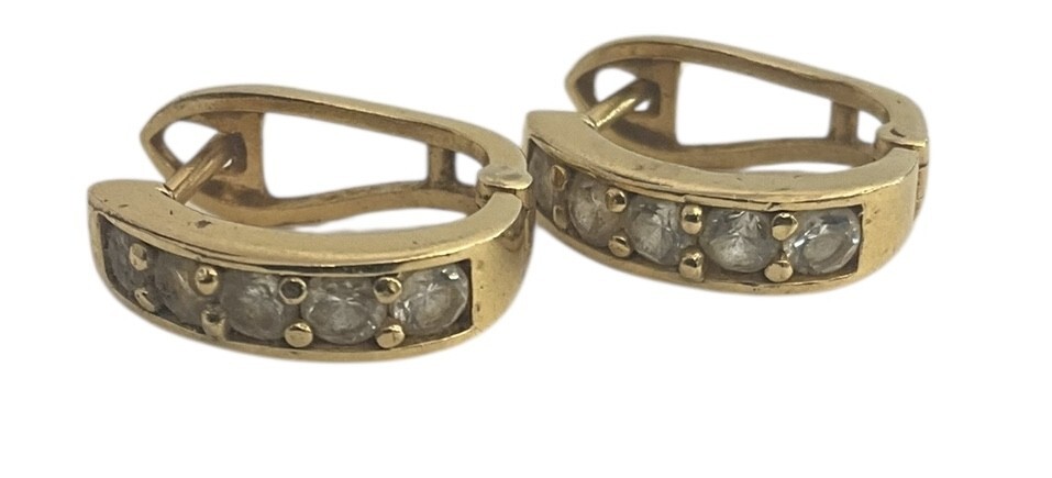 Type: EarringsWeight: 1.0Karat: 14ktMetal: Yellow GoldGender: Women'sStyle: FancySize / Length: .75"Owner applied: naStone 1 quantity: 14Stone 1 shape: RoundStone 1 color: ClearStone 1 weight (total): .50Stone 1 type: Cubic ZirconiaCondition:Used