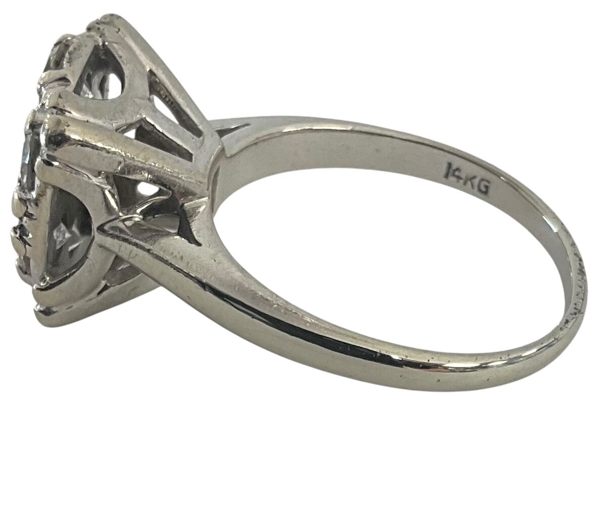 Type: Cluster ringWeight: 3.4Karat: 14ktMetal: White GoldGender: Women'sStyle: ClusterSize / Length: 7.5Owner applied: 14kgStone 1 quantity: 7Stone 1 shape: RoundStone 1 color: ClearStone 1 weight (total): 1.05Stone 1 type: DiamondCondition:Used