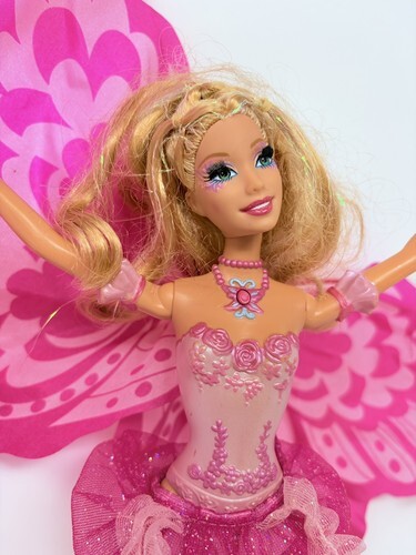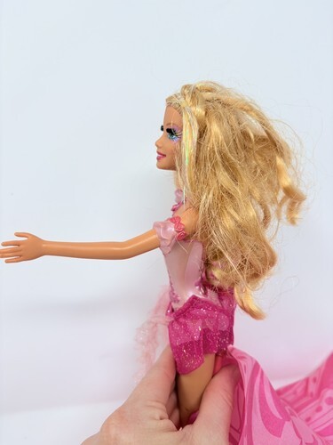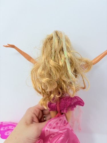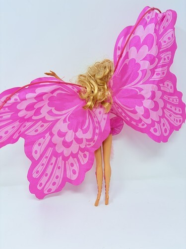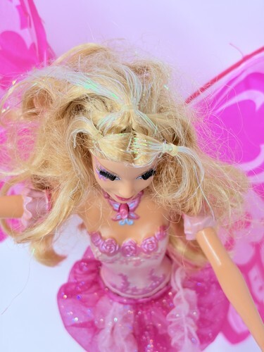 for a Barbie Fairytopia Mermaidia mermaid to fairy Elina doll. She has her wings, though one side is a little bent and hangs downward. Luckily the plastic is not physically bent or broken so with heat and patience you may be able to get it to stand up again. She is in good condition otherwise.