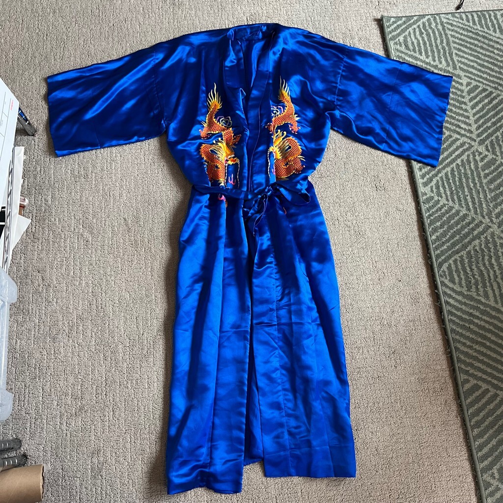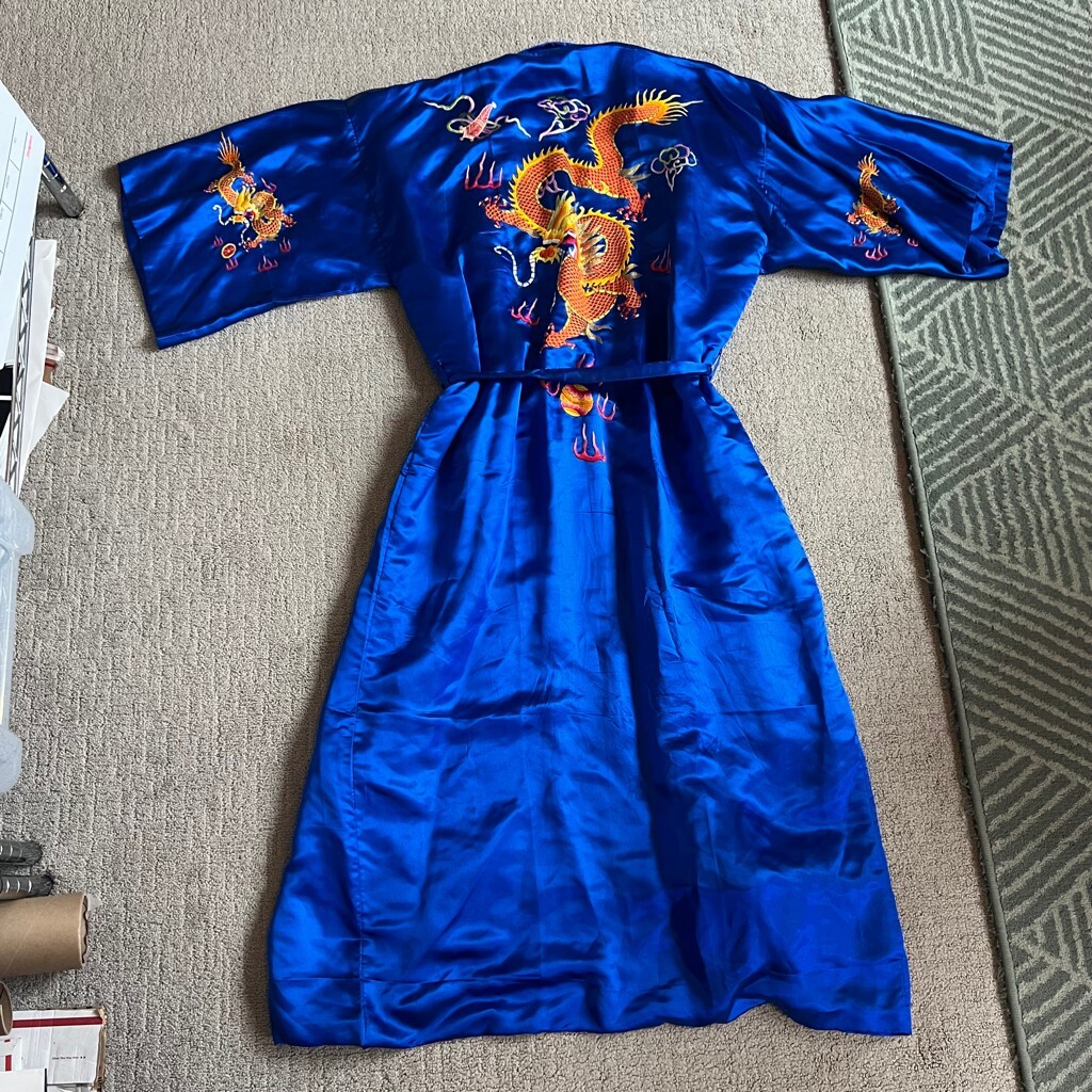 Vintage Golden Bee Women’s Embroidered Dragon Silk Blend Robe Sz L Blue W/ Belt