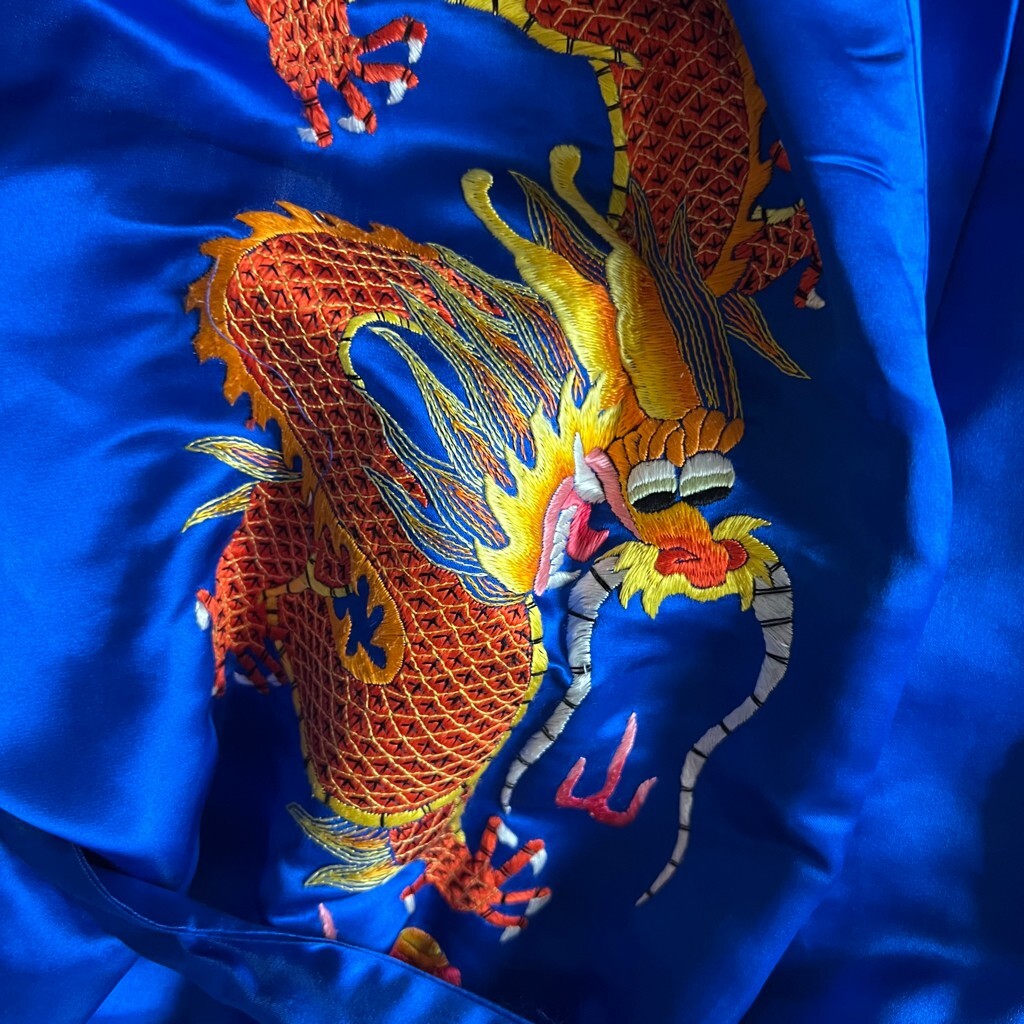 Indulge in luxurious comfort and style with this exquisite Vintage Golden Bee Women's Embroidered Dragon Silk Blend Robe. Designed for those who appreciate elegance and tradition, this robe is crafted from a luscious silk blend material, offering a silky-soft touch and delightful sheen. The vibrant blue hue is adorned with intricately embroidered golden dragons and colorful motifs, symbolizing power and good fortune.